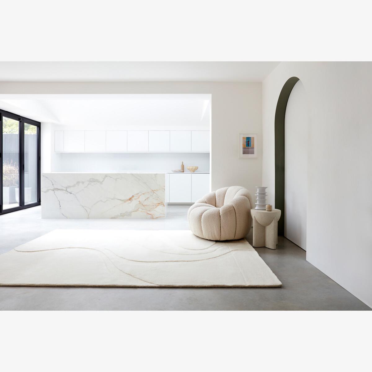 This swirl-shaped, carved rug in 100% wool is a versatile piece that adds subtle texture and visual interest to modern or minimalist interiors. I love it for its understated elegance and durability, making it practical for living rooms or bedrooms with high footfall. It works particularly well in neutral colour palettes, complementing contemporary furniture with clean lines, but can also enhance an eclectic look when paired with bold accents. For styling tips, layering it with a larger plain rug can create cosy zones, while pairing with soft textiles and simple accessories keeps the overall look sleek and sophisticated. Its carved detailing brings a tactile element that elevates the simplicity of any space.