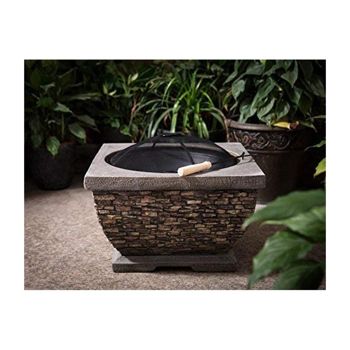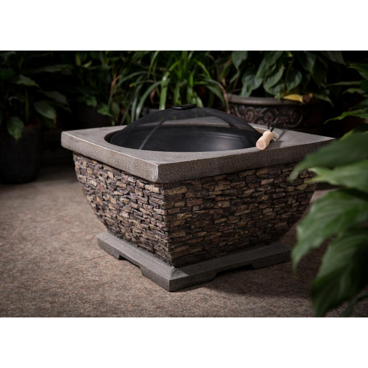 This attractive, square wood burning fire pit is finished with an intricate stone effect body and would compliment any outside space. The fire bowl is capable of withstanding high temperatures and is painted black to protect against rust. Also included with this premium fire pit are a fuel grate, spark guard and poker. Complete and requiring no construction, simply remove it from the box and place it in your chosen location.