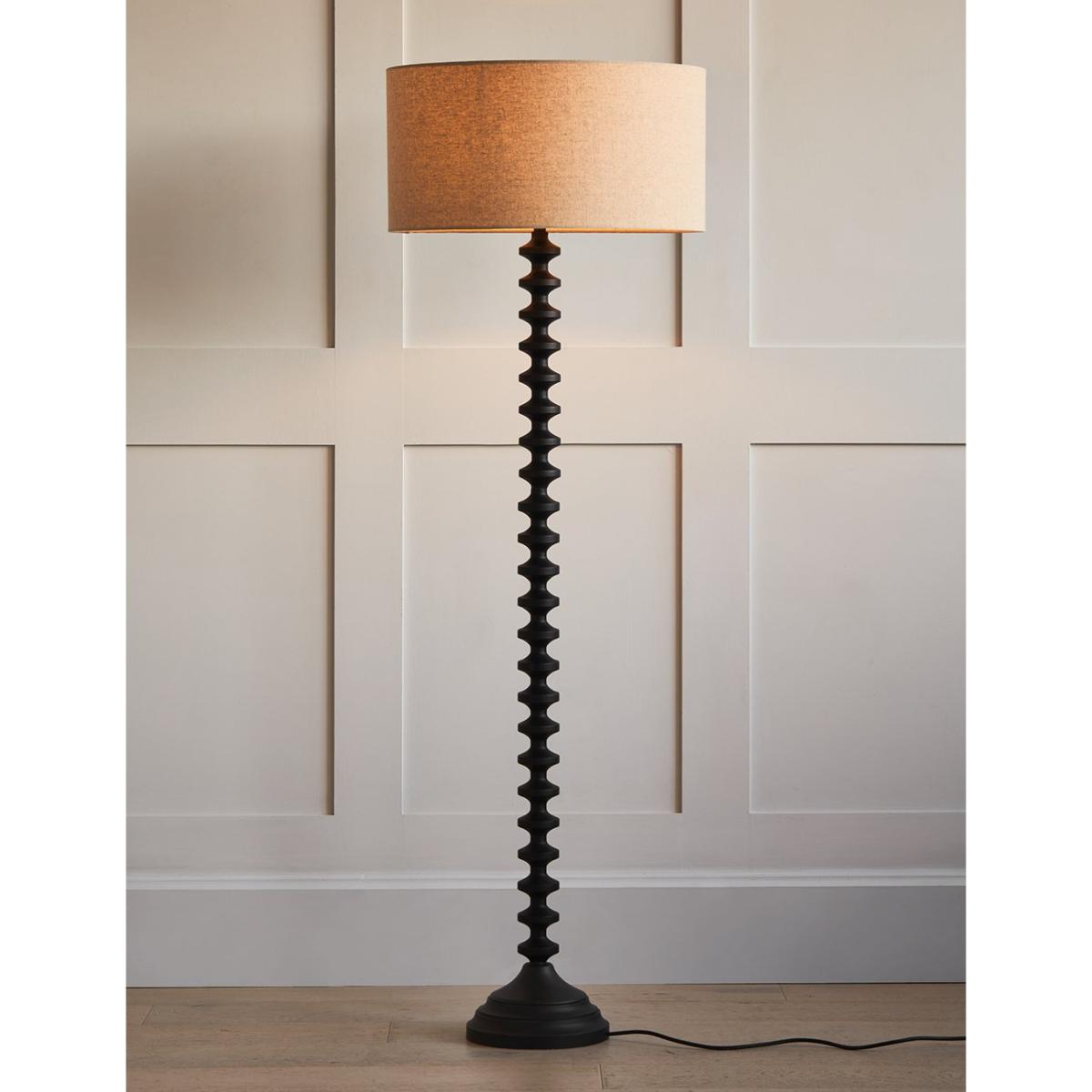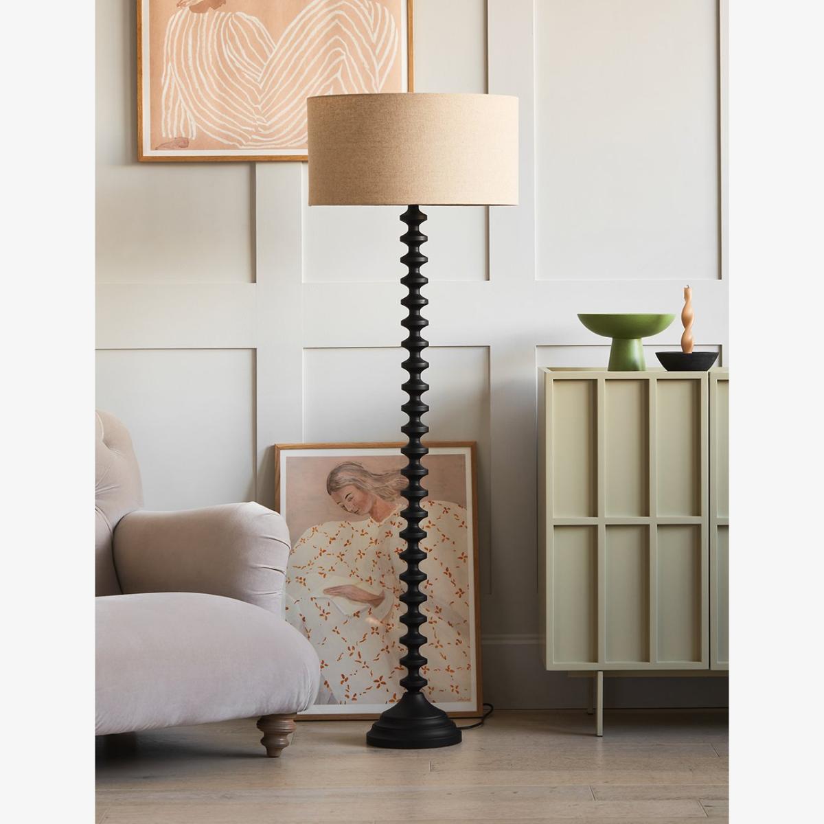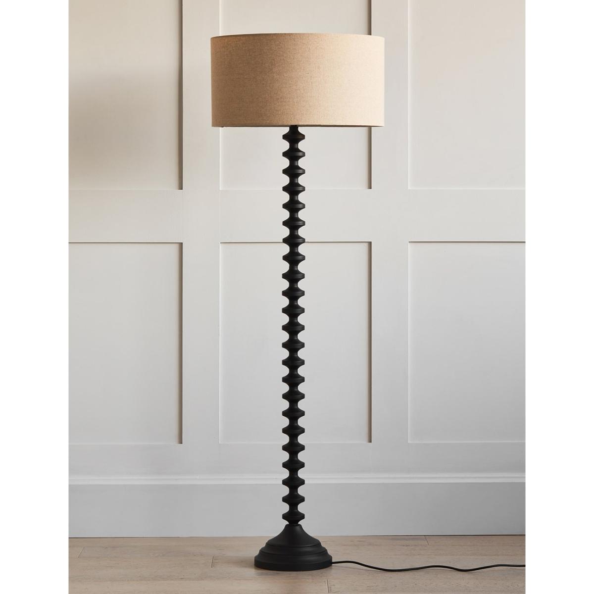 PREORDER NOW FOR DELIVERY BY MID DECEMBER!Bring a warm and inviting glow to your home with our best-selling Black Bobbin Base Floor Lamp. This interior design favourite features a classic black finish that perfectly complements the simple nude lampshade. With a stacked geometric design, the lamp falls perfectly into place in both a contemporary and classic-style home. Crafted from Tsubaki wood and designed to light up any corner of your home with a warm and welcoming glow. Also available in classic wooden colourway.