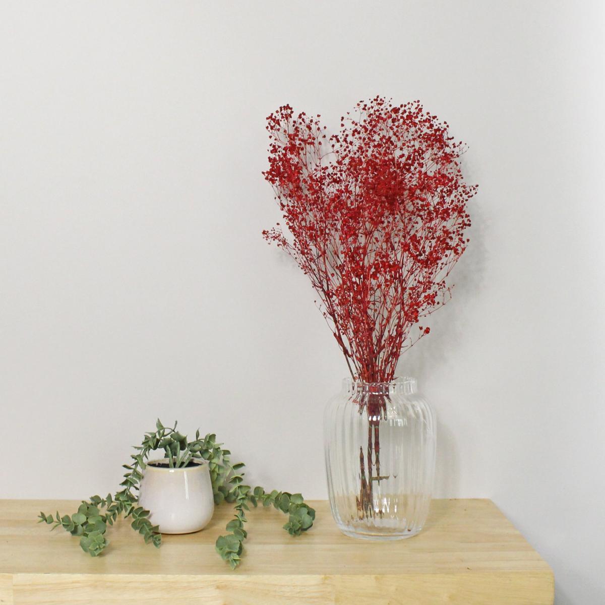 Brighten up a loved one's day with this stunning bundle of russet red Gypsophila dried flower bundle. Beautifully gift wrapped in paper, cellophane, and a jute string to hold the flowers together. For a homely touch, why not add it to a vase or pot for decoration? This bundle is available in other colours. Top tips:.