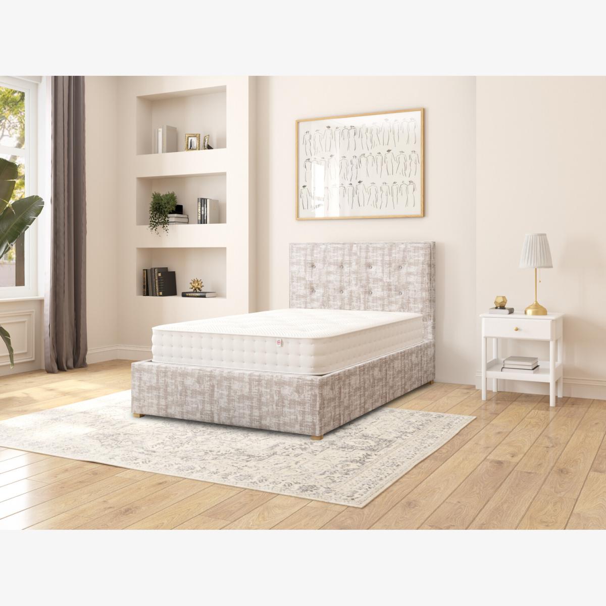 Quality upholstered ottoman storage bed, hand crafted in the UK. Each headboard is constructed with deep foam padding perfect for sitting up in bed and reading. We believe quality has no short cuts, meaning all our designs are hand upholstered by our skilled craftsmen. Our UK ottoman design features chunky upholstered panels, which means it is built to last. Quality sprung slats improve comfort and mattress lifespan. The easy lift ottoman mechanism is supported with quality gas pistons, enabling the storage to be accessed with minimal effort. Once the ottoman is elevated it will hold position, allowing hands free access to storage. Our ottomans offer the perfect storage solutions for rooms with no or limited space with a spacious storage area of approximately 28cm. The fabric base attaches to the underside of the bed, protecting your stored items. Each ottoman is finished with hardwood feet which have been hand turned and varnished.