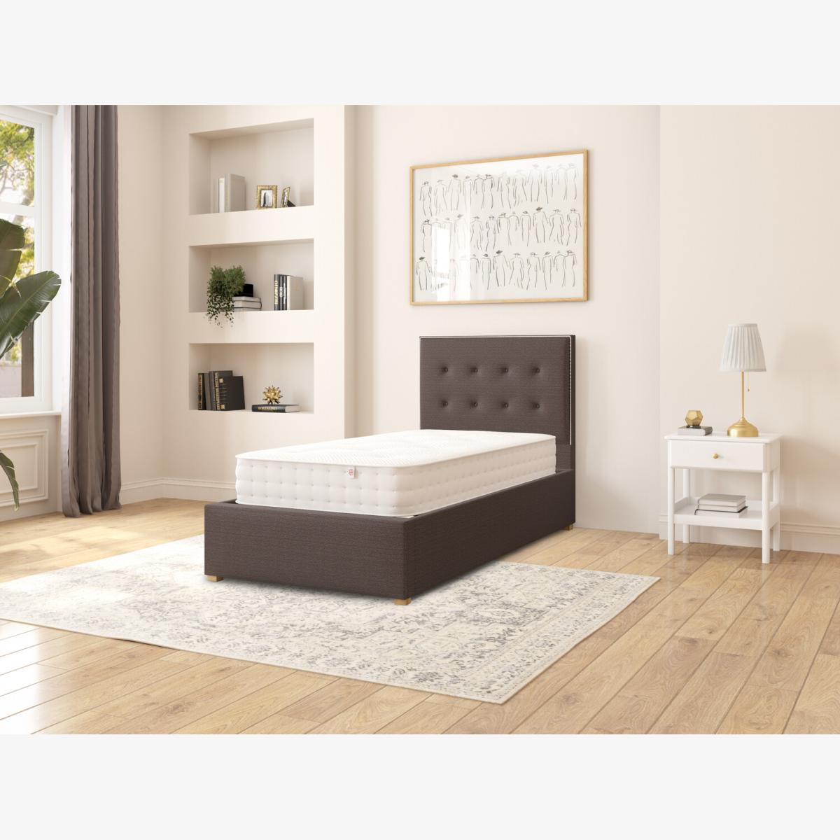 Quality upholstered ottoman storage bed, hand crafted in the UK. Each headboard is constructed with deep foam padding perfect for sitting up in bed and reading. We believe quality has no short cuts, meaning all our designs are hand upholstered by our skilled craftsmen. Our UK ottoman design features chunky upholstered panels, which means it is built to last. Quality sprung slats improve comfort and mattress lifespan. The easy lift ottoman mechanism is supported with quality gas pistons, enabling the storage to be accessed with minimal effort. Once the ottoman is elevated it will hold position, allowing hands free access to storage. Our ottomans offer the perfect storage solutions for rooms with no or limited space with a spacious storage area of approximately 28cm. The fabric base attaches to the underside of the bed, protecting your stored items. Each ottoman is finished with hardwood feet which have been hand turned and varnished.