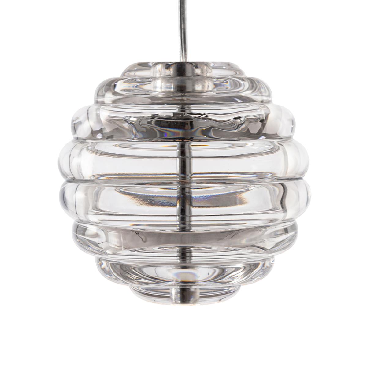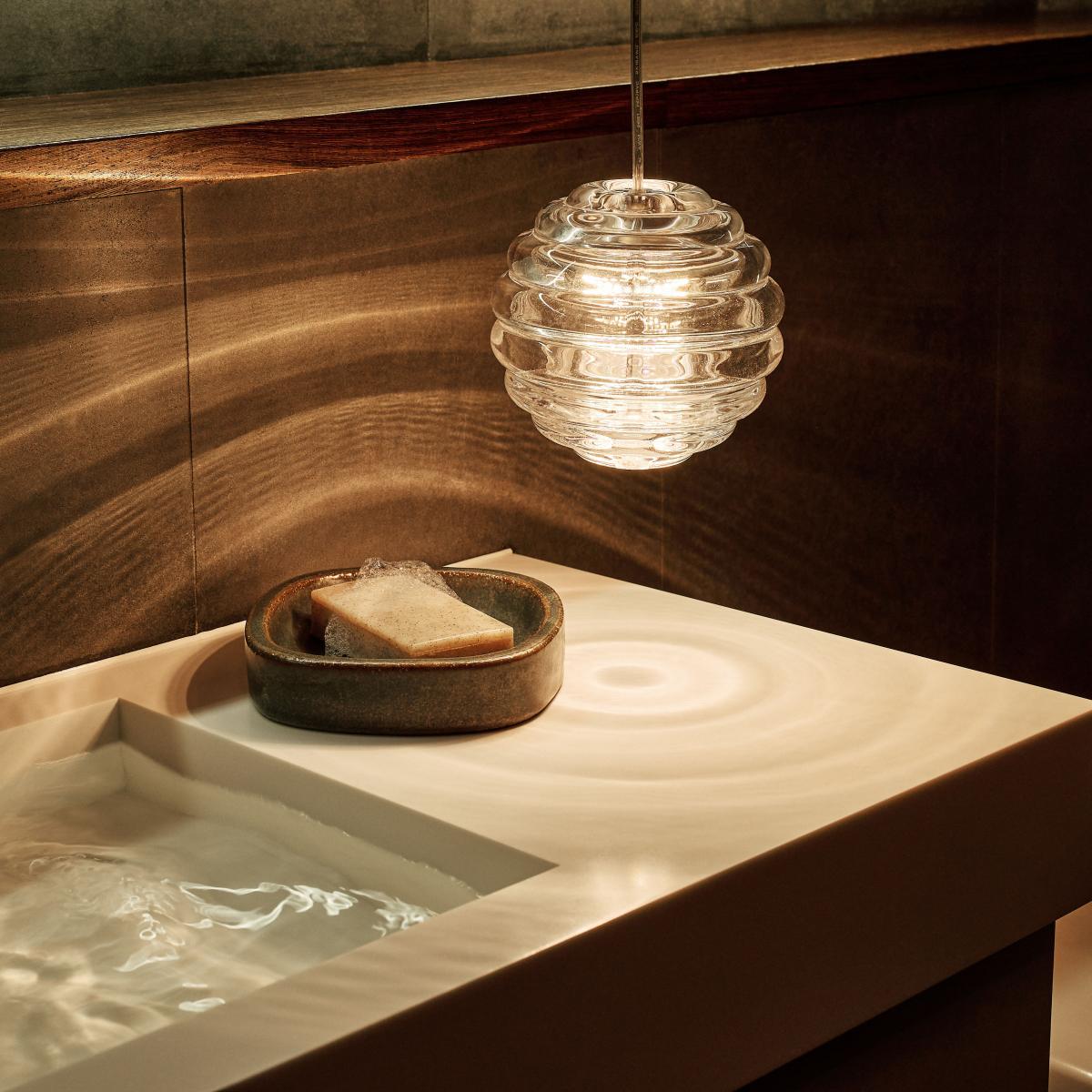 Press is a series of luminaires made from very thick, highly transparent glass. Their bouncy shape is reminiscent of sailing buoys and children's toys. Grooved glass ensures excellent light diffusion, while projecting its linear striped patterns.