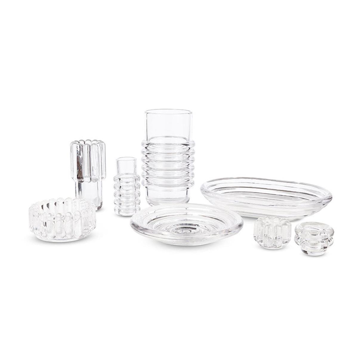This Press tealight holder from Tom Dixon is an essential addition to your design-conscious home. Made from chunky coils of pure and clear transparent glass, it is made by dropping big drops of molten glass at 1,200 degrees centigrade into two or three part-iron moulds to create its unique yet familiar silhouette. Designed to catch and refract the light, it makes a statement wherever it’s placed.
