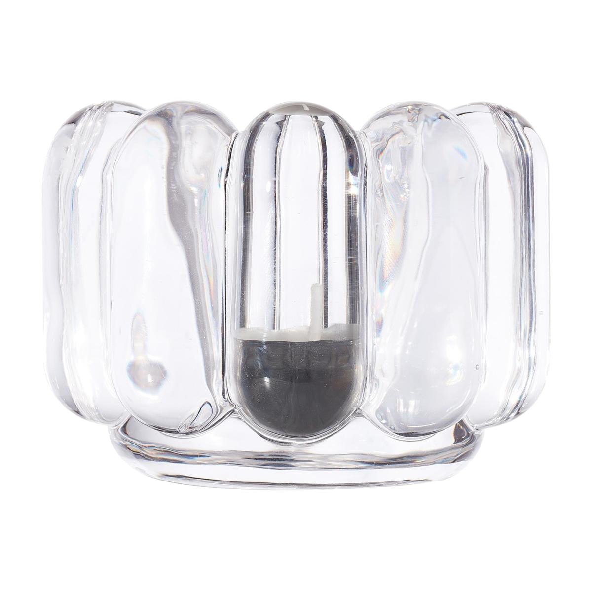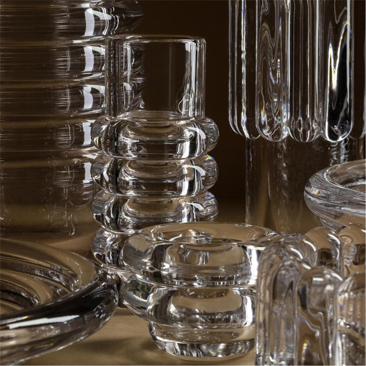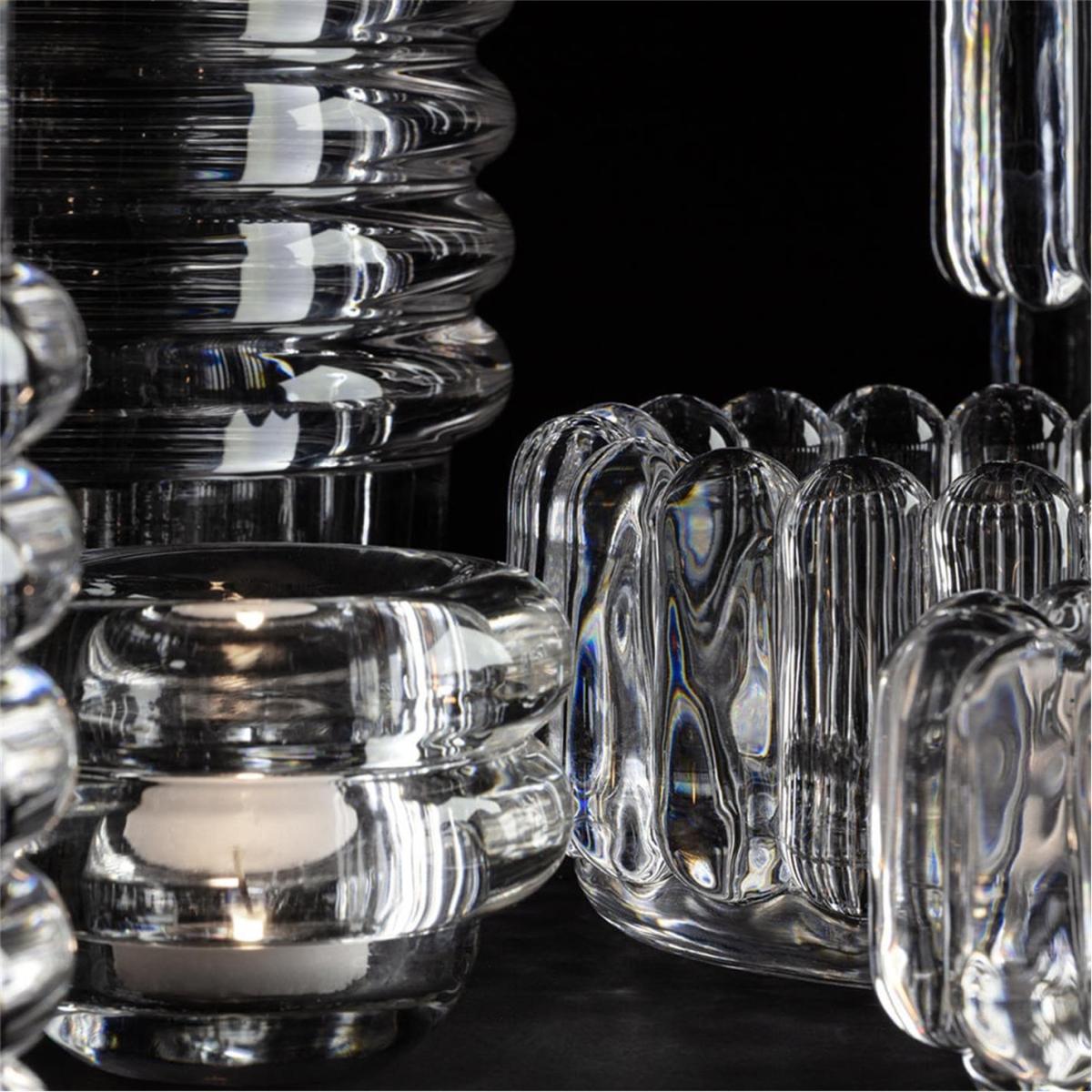 I love this little tealight holder for its sculptural glass design, which adds subtle elegance without being too delicate. It works beautifully in contemporary or minimalist interiors, but can also add a touch of modern sophistication to more eclectic spaces. Practical styling tips include grouping a few together on a dining table or mantle for a cosy, ambient glow, or placing it on a coffee table alongside other textured accessories to create visual interest. Its transparent nature means it blends seamlessly with various colour schemes, making it a versatile choice for lighting up any corner of the home.
