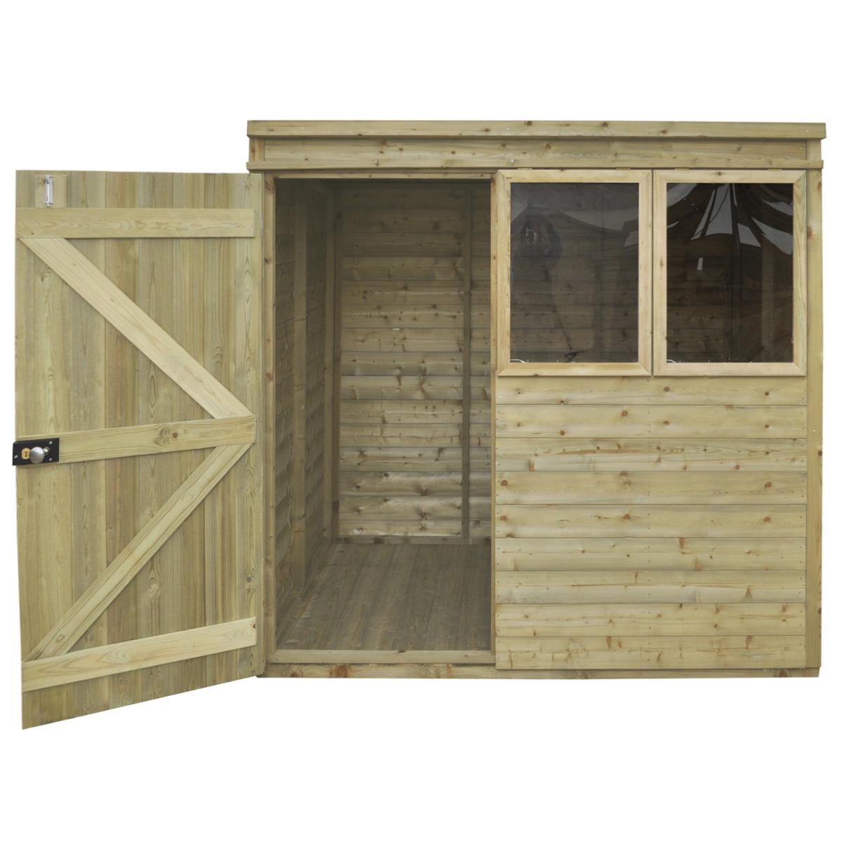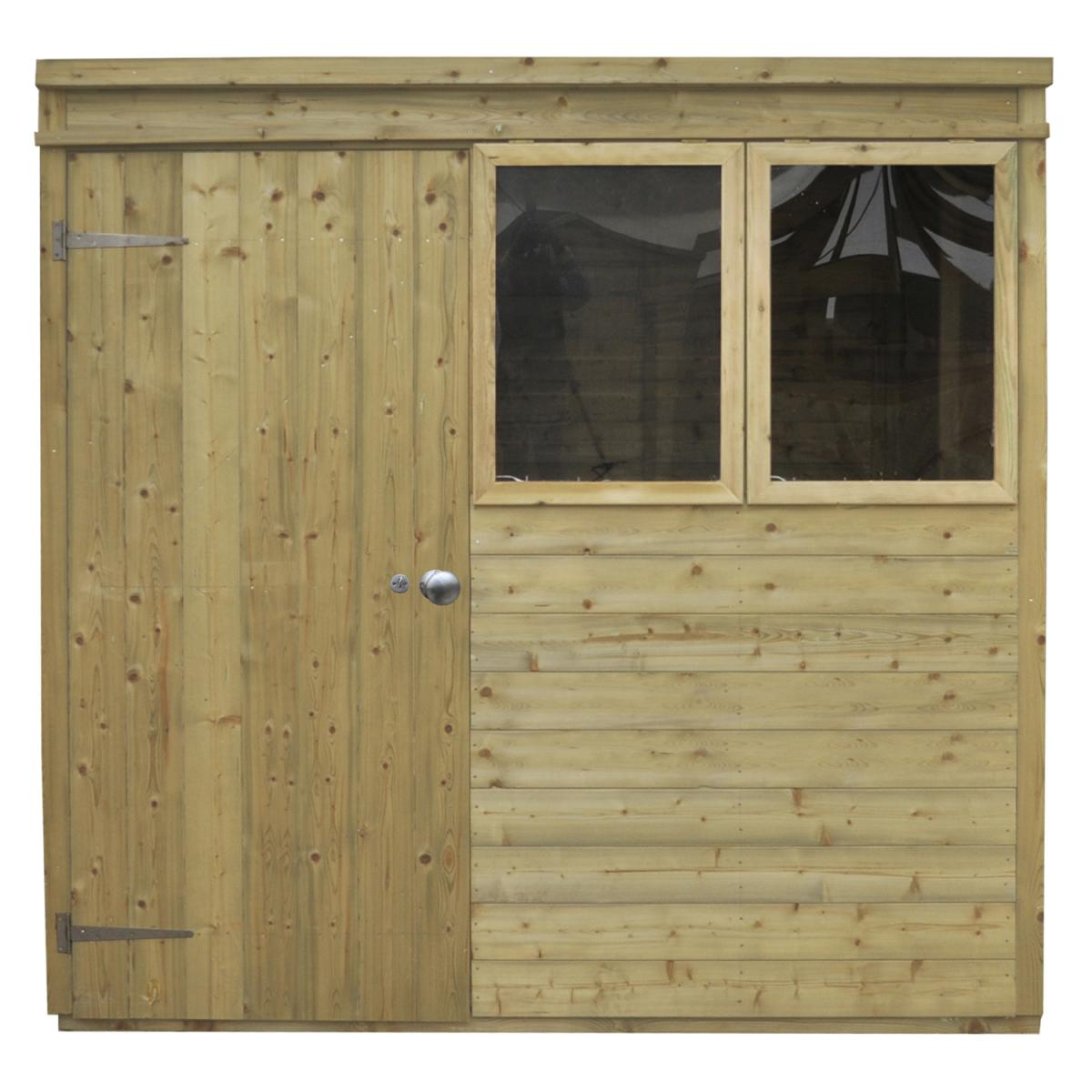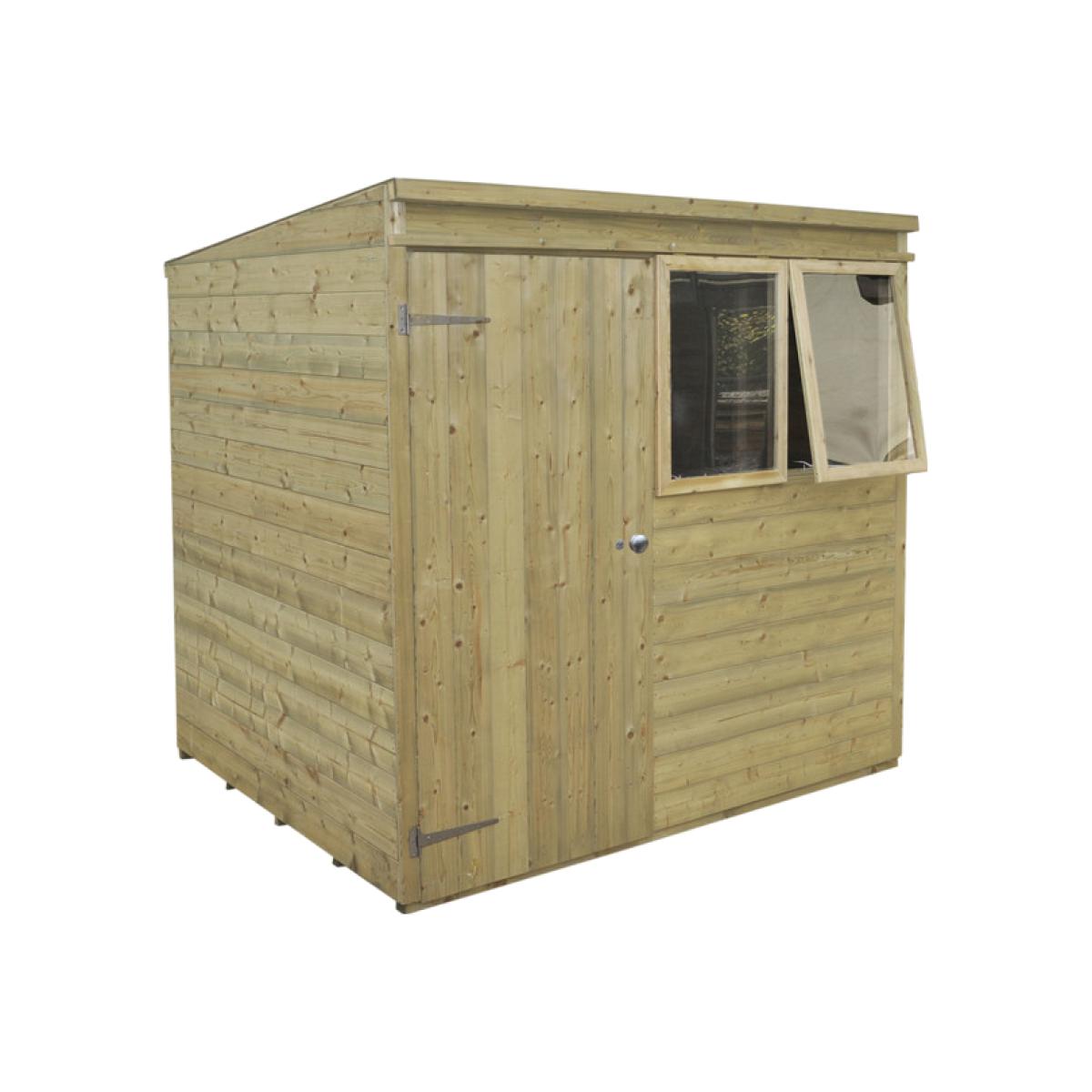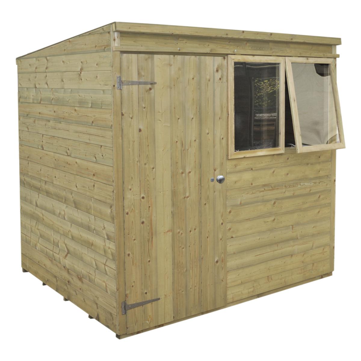 The beautiful Pressure Treated Tongue & Groove 7x5 Pent Shed is a premium quality building which is ideal for storing away your tools and equipment and keeping your garden neat and tidy. The pent roof design is ideal for positioning against a wall or fence and offers good head room at the front of the shed along with plenty of storage space at the back. This Pent Shed is manufactured from high quality, smooth-planed Tongue & Groove boards and supported by sturdy framing. The floor also utilises Tongue & Groove boards, mounted on floor bearers, and all of the timber used in the shed has been Pressure Treated, giving it a 15 year Anti-Rot guarantee. The windows of this shed are made from premium acrylic glazing, and one can be opened and held with a multi-position latch to provide ventilation while you are working. The sturdy double 'Z' framed door can be secured with a rim lock. The roof is constructed using interlocking Tongue & Groove boards, in place of the more common OSB sheet, and is finished with attractive red mineral felt. Manufactured using timber from sustainable sources. , all the fixtures, fittings and felt needed to build this 7x5 shed are included, along with easy to follow instructions.