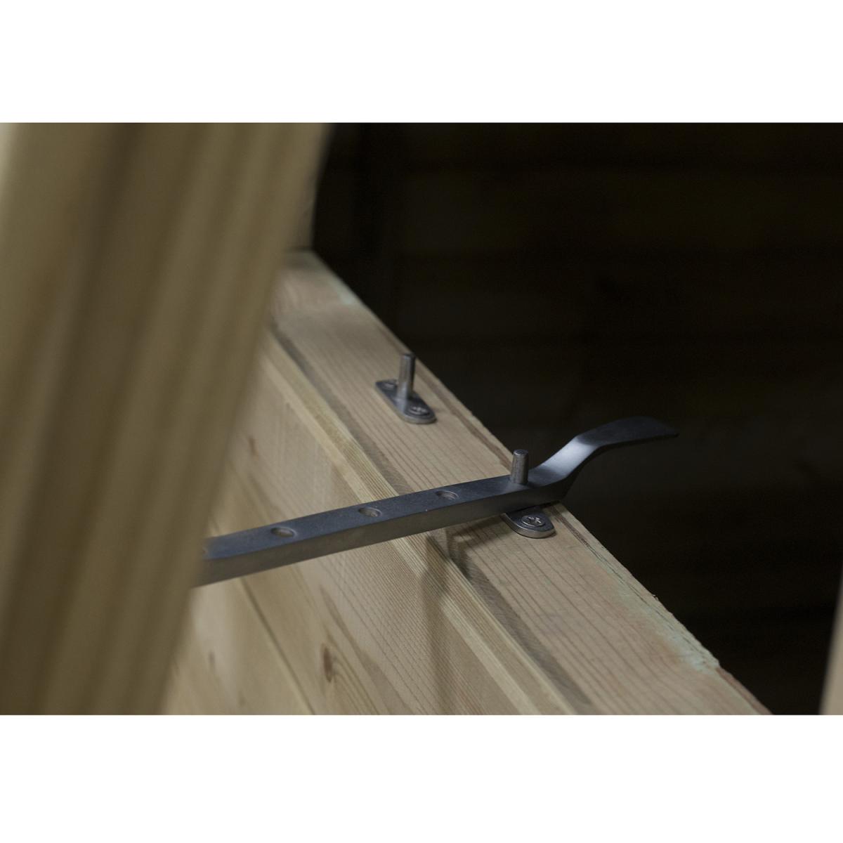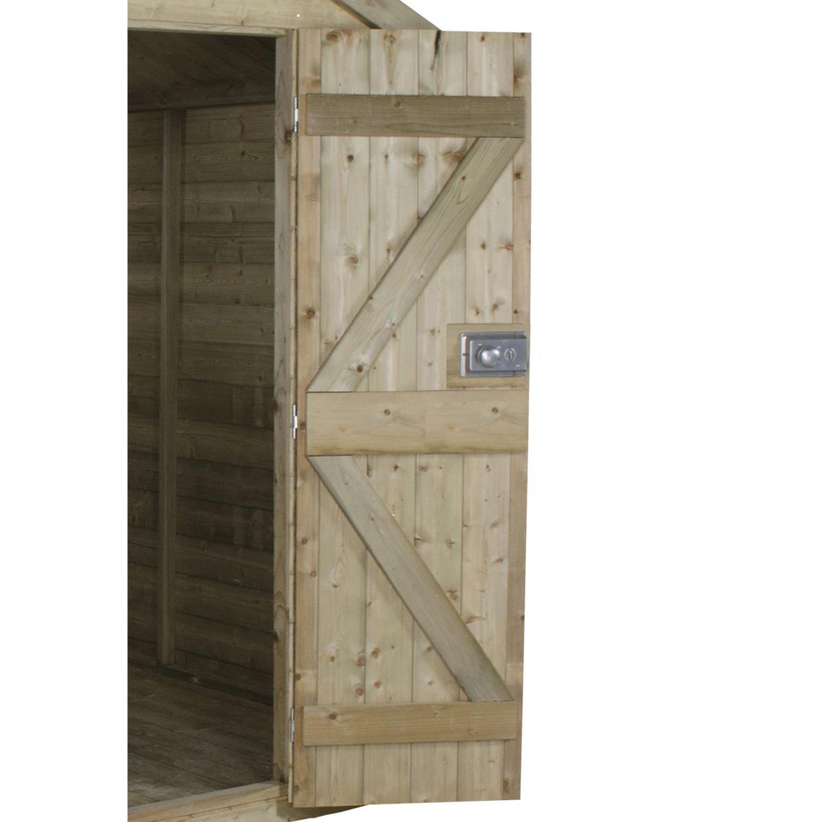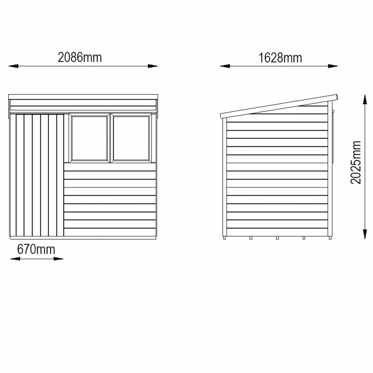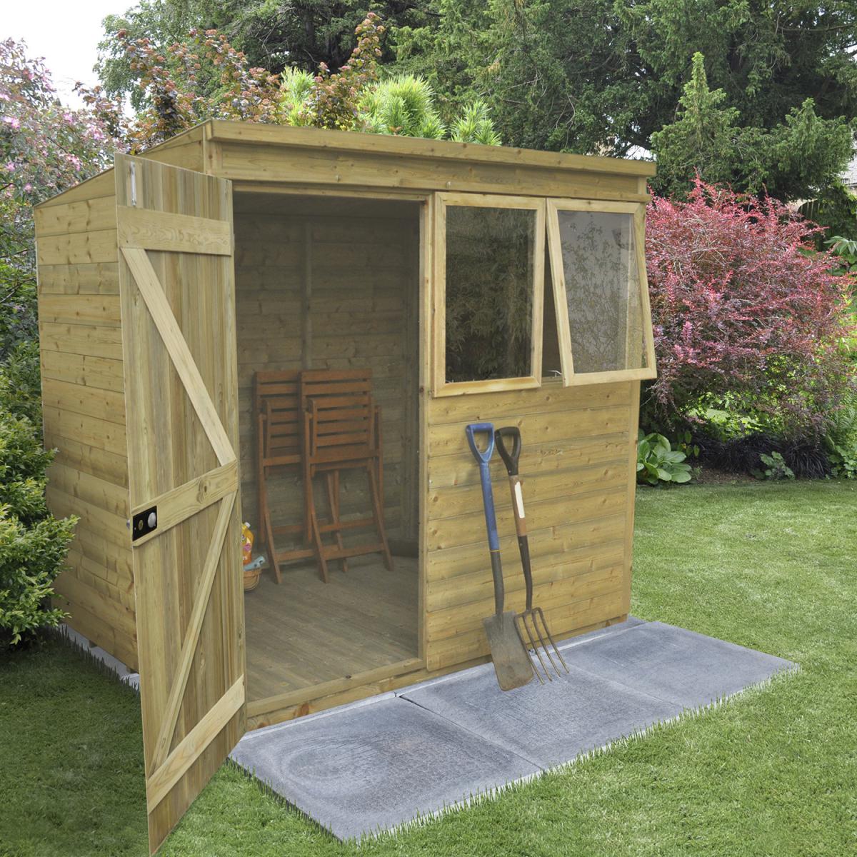 The beautiful Pressure Treated Tongue & Groove 7x5 Pent Shed is a premium quality building which is ideal for storing away your tools and equipment and keeping your garden neat and tidy. The pent roof design is ideal for positioning against a wall or fence and offers good head room at the front of the shed along with plenty of storage space at the back. This Pent Shed is manufactured from high quality, smooth-planed Tongue & Groove boards and supported by sturdy framing. The floor also utilises Tongue & Groove boards, mounted on floor bearers, and all of the timber used in the shed has been Pressure Treated, giving it a 15 year Anti-Rot guarantee. The windows of this shed are made from premium acrylic glazing, and one can be opened and held with a multi-position latch to provide ventilation while you are working. The sturdy double 'Z' framed door can be secured with a rim lock. The roof is constructed using interlocking Tongue & Groove boards, in place of the more common OSB sheet, and is finished with attractive red mineral felt. Manufactured using timber from sustainable sources. , all the fixtures, fittings and felt needed to build this 7x5 shed are included, along with easy to follow instructions.