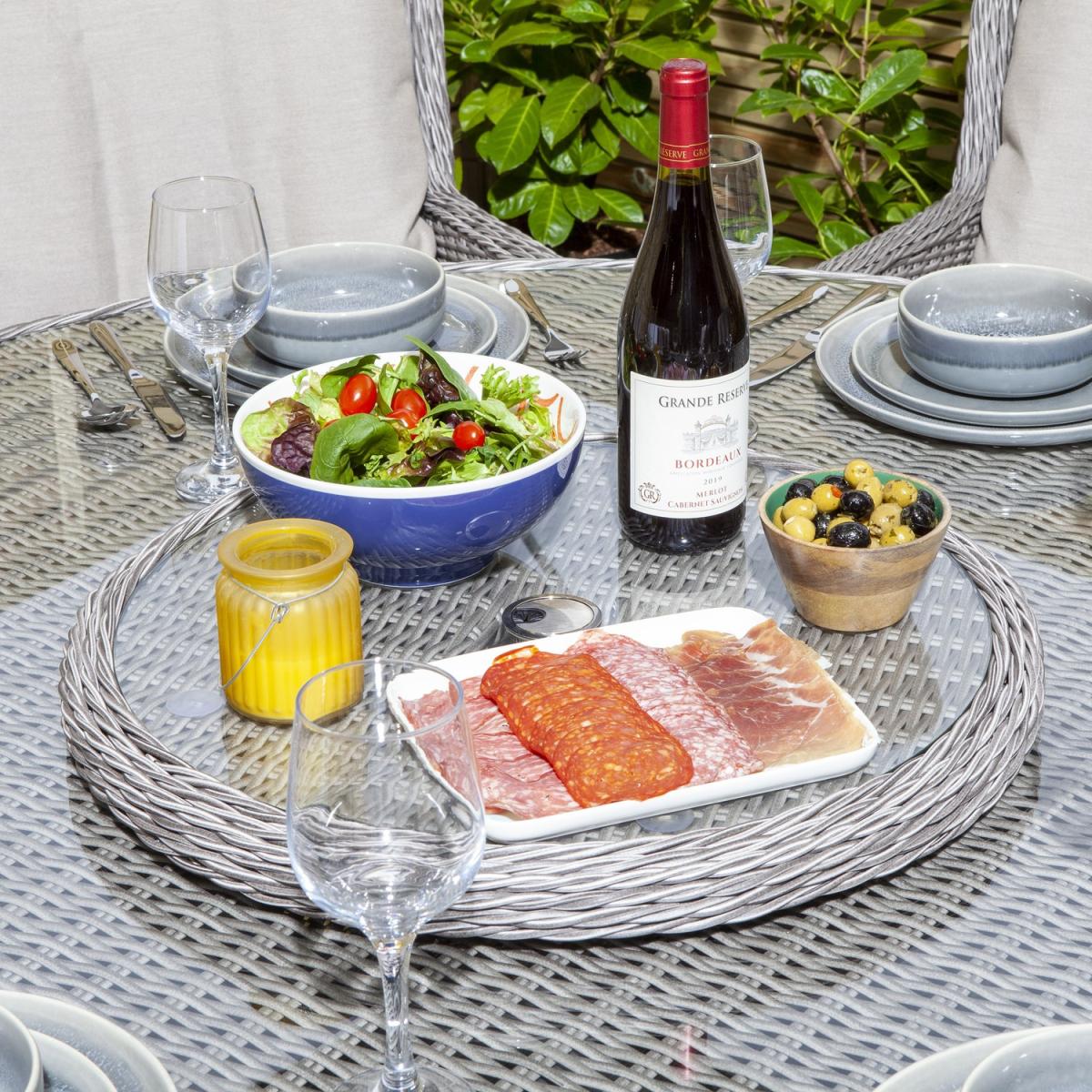 Chair Dimensions H95cm x W64cm x D68cm Table Dimensions H75cm x W150cm. This stunning seven-piece dining set is the perfect new addition to your garden this summer season. Great for entertaining friends and family. The rattan effect weave is also waterproof making the piece suitable for indoor and outdoor use. Features. Glass top table. Powder-coated aluminium frames6.5mm half round wicker with full round detailing. Back rest cushions and seat pads included. Natural stone coloured rattan warm grey cushions with dark grey piping..