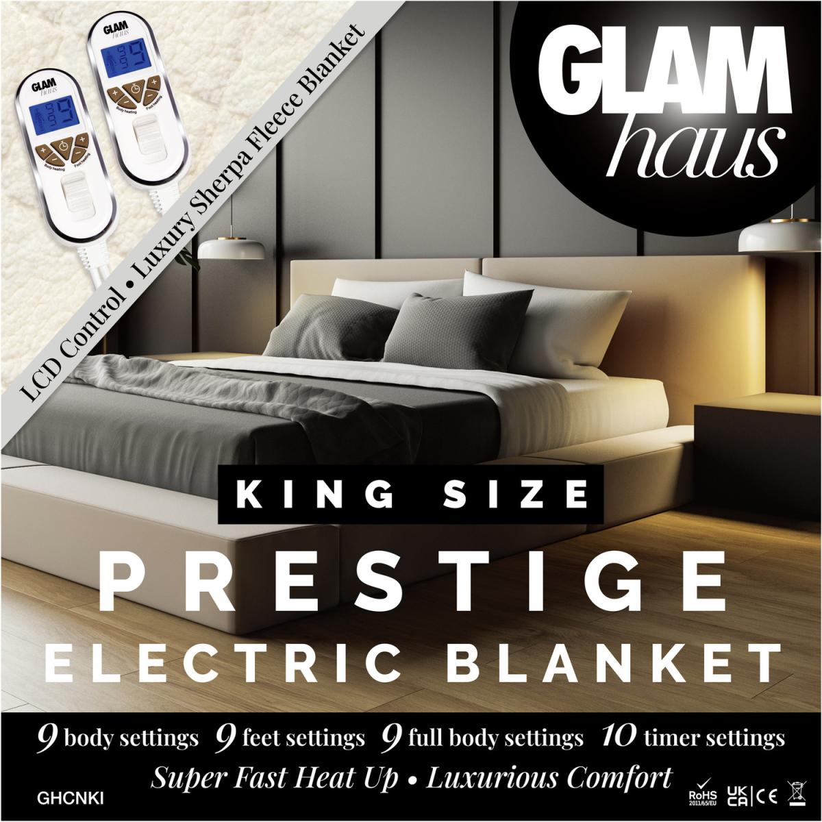 Sumptuously soft, opulently cosy Sherpa Fleece high-quality fabric that adds a touch of class and luxury to your bed, manufactured to the highest standards - keeping you cosy and warm in the autumn and winter, a real exquisite luxurious finish - all of which contribute to a peaceful cosy night's sleep. With an illuminated dimmable simple-use LCD control that offers 9 heat settings, 10 timer settings and an ultra-fast heat-up time, you can use your Glamhaus Prestige Electric Blanket in all seasons and tailor the heat and timer settings to suit your individual needs