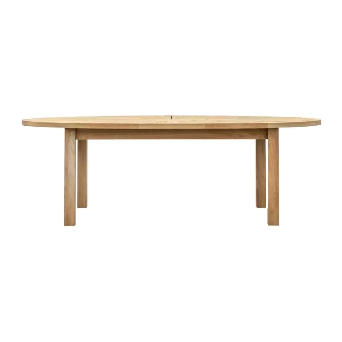 This stunning oval dining table features an eye-catching radial design for the top with built-in lazy susan, inset so it is the same height as the table top for added practicality. The table is crafted from teak, which is an ideal material for outdoor furniture because of its incredible durability and water resistance. The table works perfectly with the coordinating curved benches, or with our Vandra teak chairs. Material: Teak. Colour/Finish: Natural.