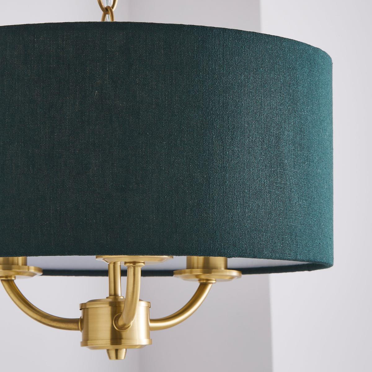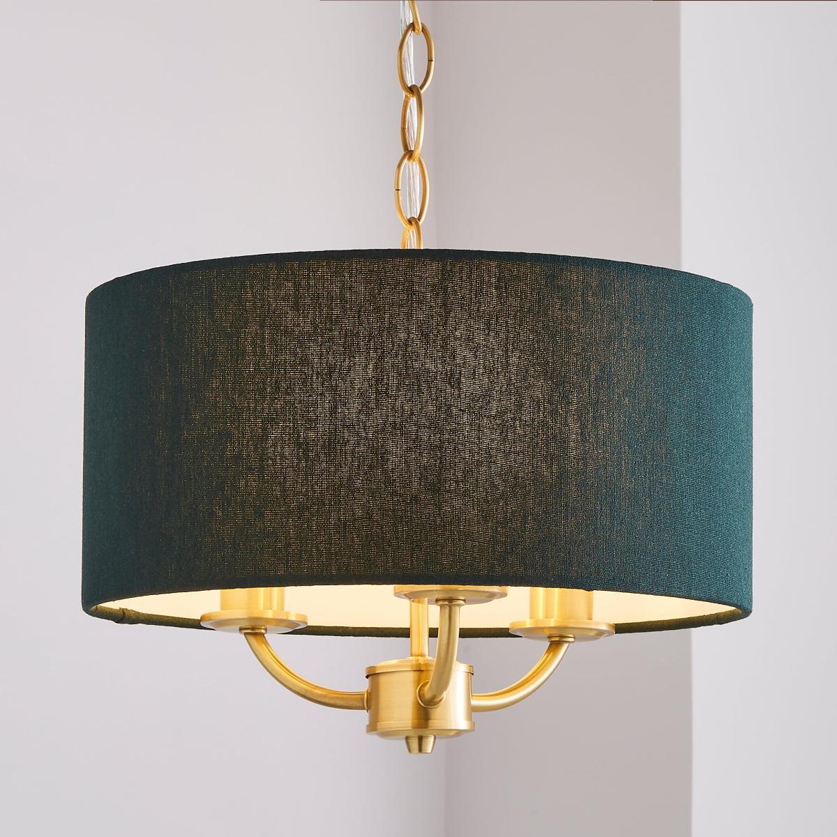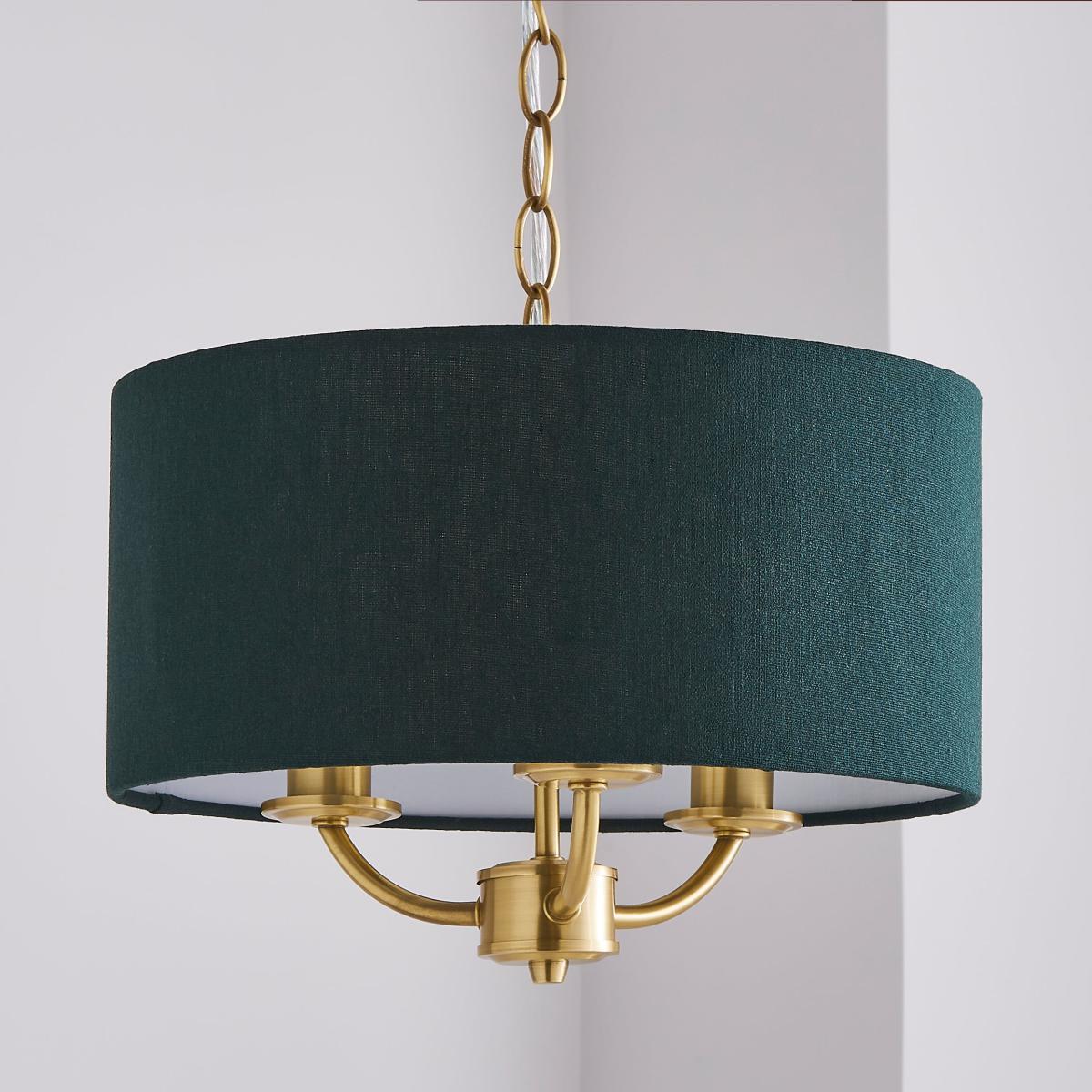 Offering a timeless, classic style, the Preston 3 light ceiling fitting features a stunning satin brushed gold finish, paired with an elegant bottle green coloured linen effect shade in a choice of stunning colours and suspended from a height adjustable, decorative chain.