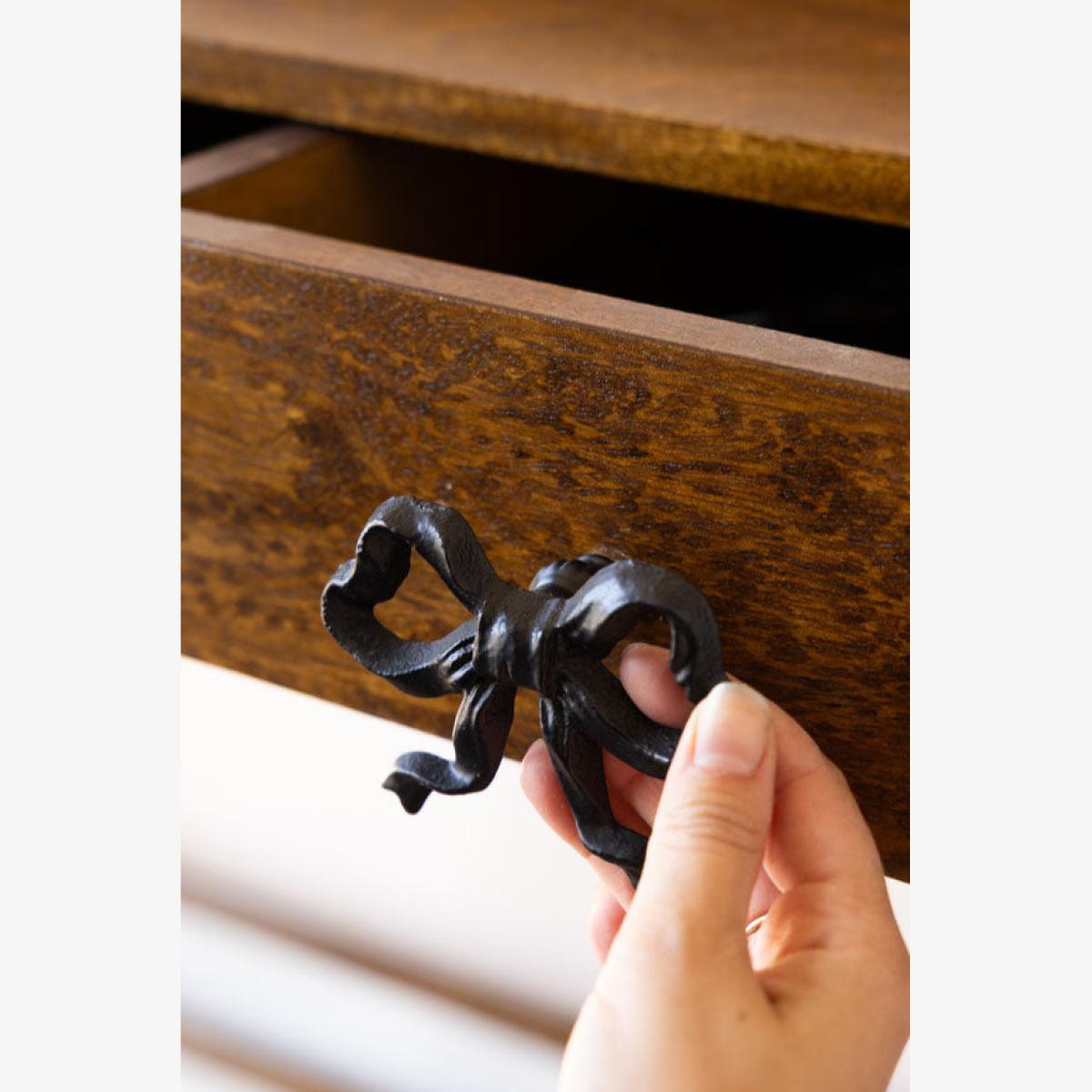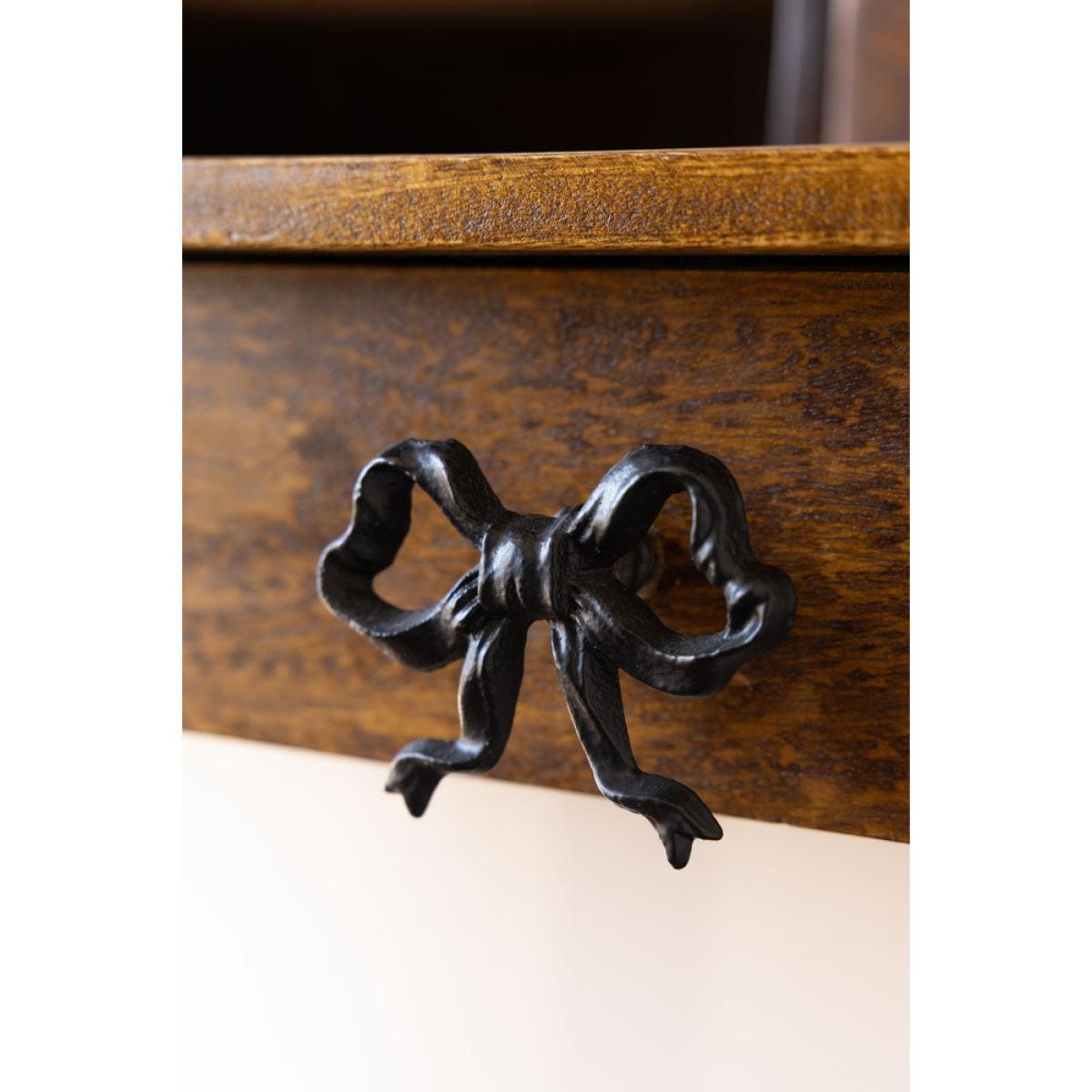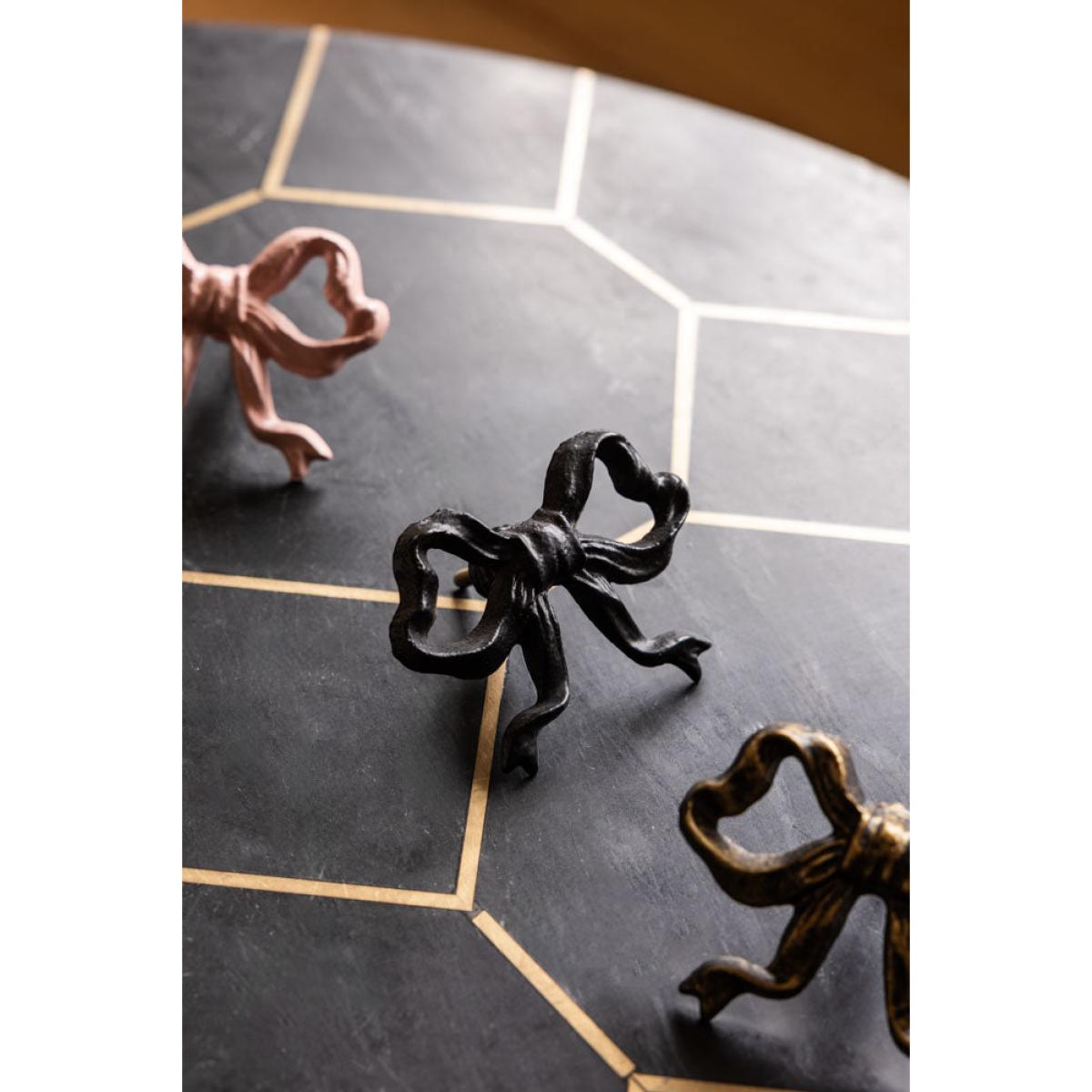 Introducing the Pretty Black Bow Cupboard/Drawer Knob. Cute, kitsch and oh-so-stylish, this drawer knob design makes even the simplest cupboard or drawer feel instantly elevated. The bold bow shape taps into the trend for bows that we've seen everywhere in interiors, while the classic black finish works beautifully in both modern and vintage-inspired spaces. Updating cupboard door handles is perfect for giving tired furniture a glam update or adding a playful twist to a new piece. It also helps add personality to your furniture and ties everything that you love together with neat black bows, whether styled on bedside tables, dressing tables, cupboards or drawers. - Black Metal Bow Cupboard Knob - Measures: W9cm x D6.5cm x H6.5cm - Made from cast iron with a black finish - Also available in gold or pink