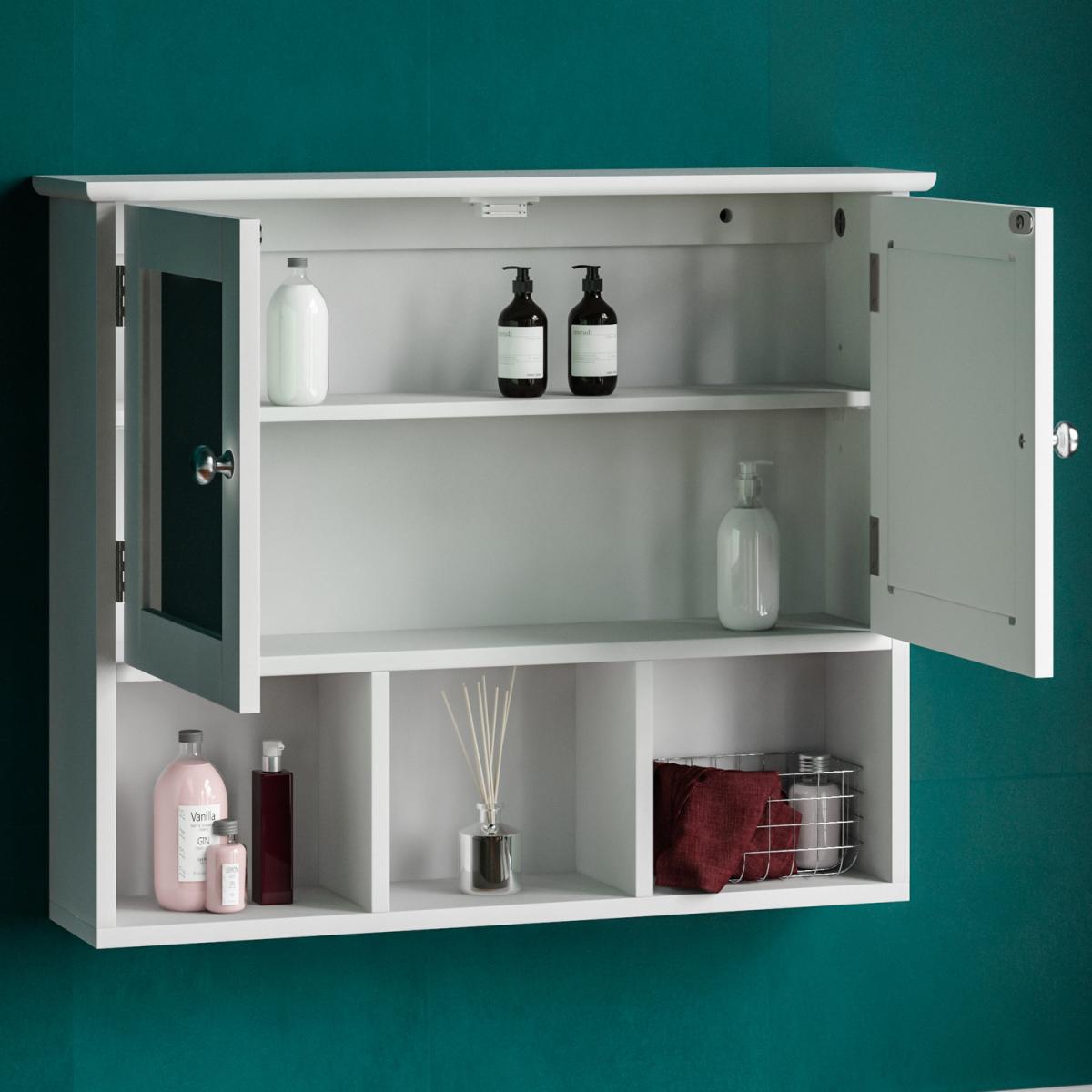 This wall mounted bathroom cabinet features a slick white finish, two mirrored doors with chromed handles and an open shelf for something you need to have easy access to. This bathroom wall cabinet is sure to make a big impression on your bathroom and also offers plenty of storage for your bathroom products and a mirror to see yourself in.