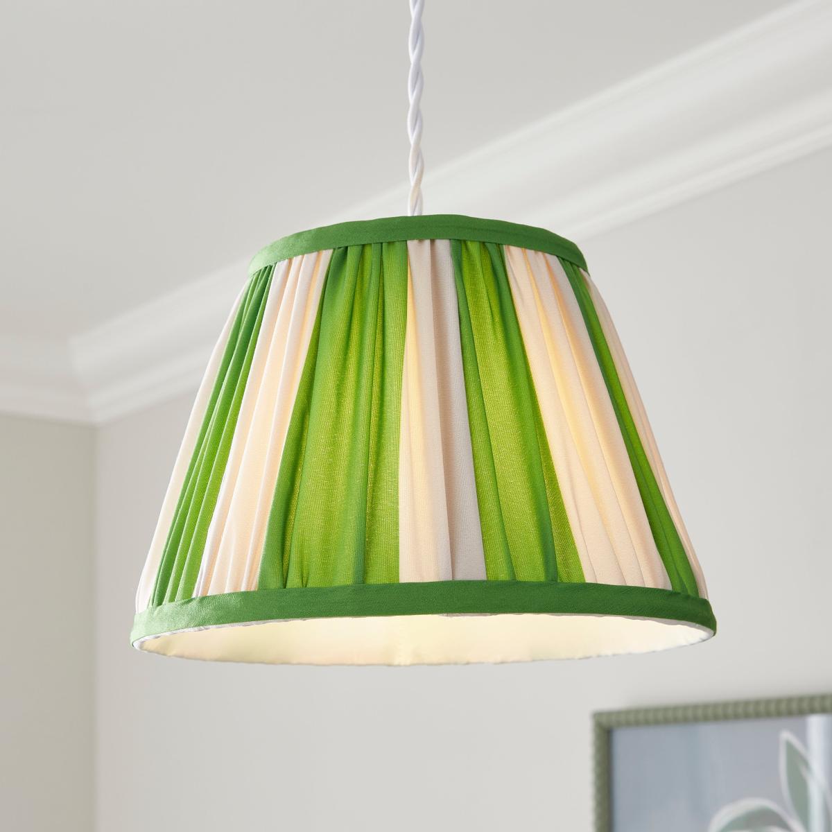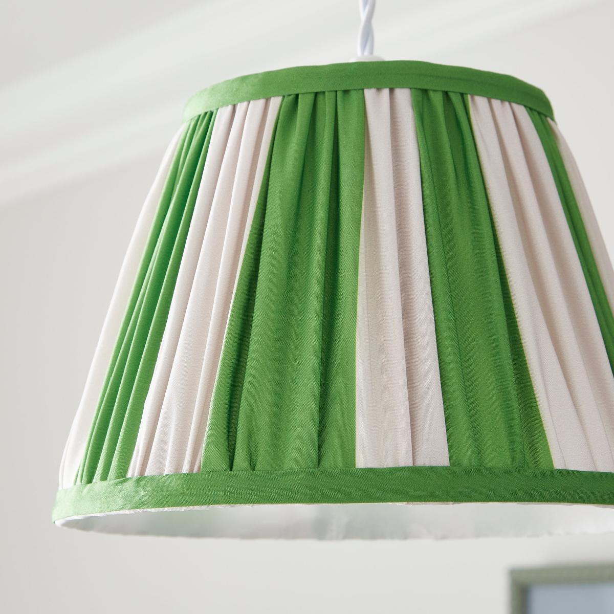 * Green Stripe Design* Pleated Lamp Shade* Sizes 15cm & 23cm - Candle Bulb, Max 40 Watts* Size 40cm - Standard GLS Bulb, Max 60 Watts* Bulb Not Included This exquisite lampshade features a stylish green stripe design with elegant pleats. Complete the look by exploring our range of matching items. Please note that the bulb is not included, so don't forget your bulb!
