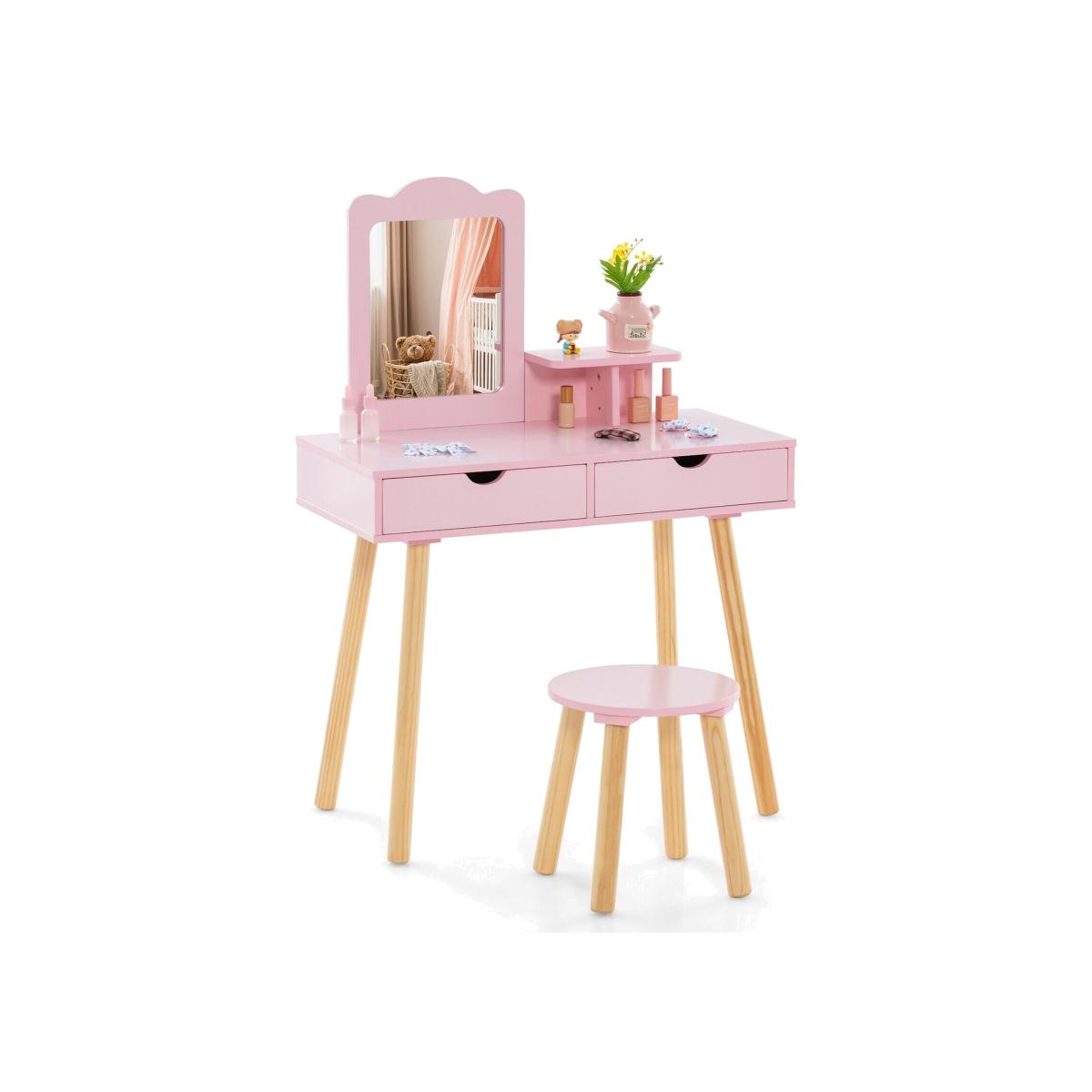 Let kids have an unforgettable childhood with this 2-in-1 kids' vanity set! This kid's vanity set is designed for versatility with a vanity table and writing desk in one. The selected materials, durable MDF and natural pine wood make the children's vanity table and stool set long-lasting. Meanwhile, the solid supporting legs and reinforced connections render this kid's vanity table and chair set more stable. The large tabletop and practical drawers create space for storage, improving kids' hands-on ability. What's more, the easy-to-clean surface allows you to maintain it conveniently. This children's vanity set also comes with EN71 certifications for reliable use. 2-in-1 versatile design