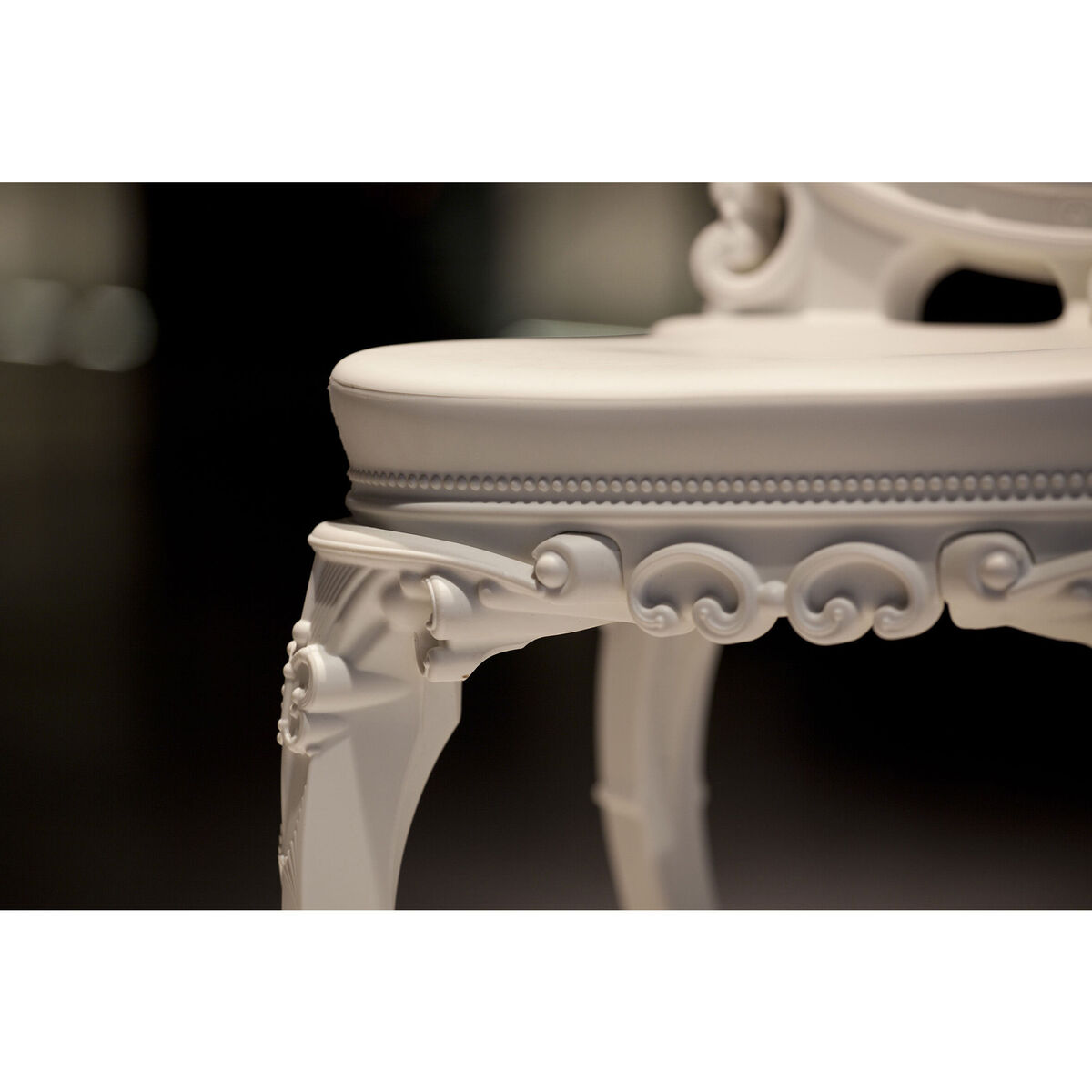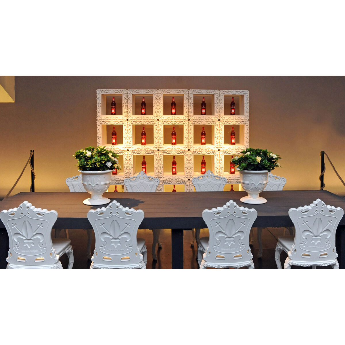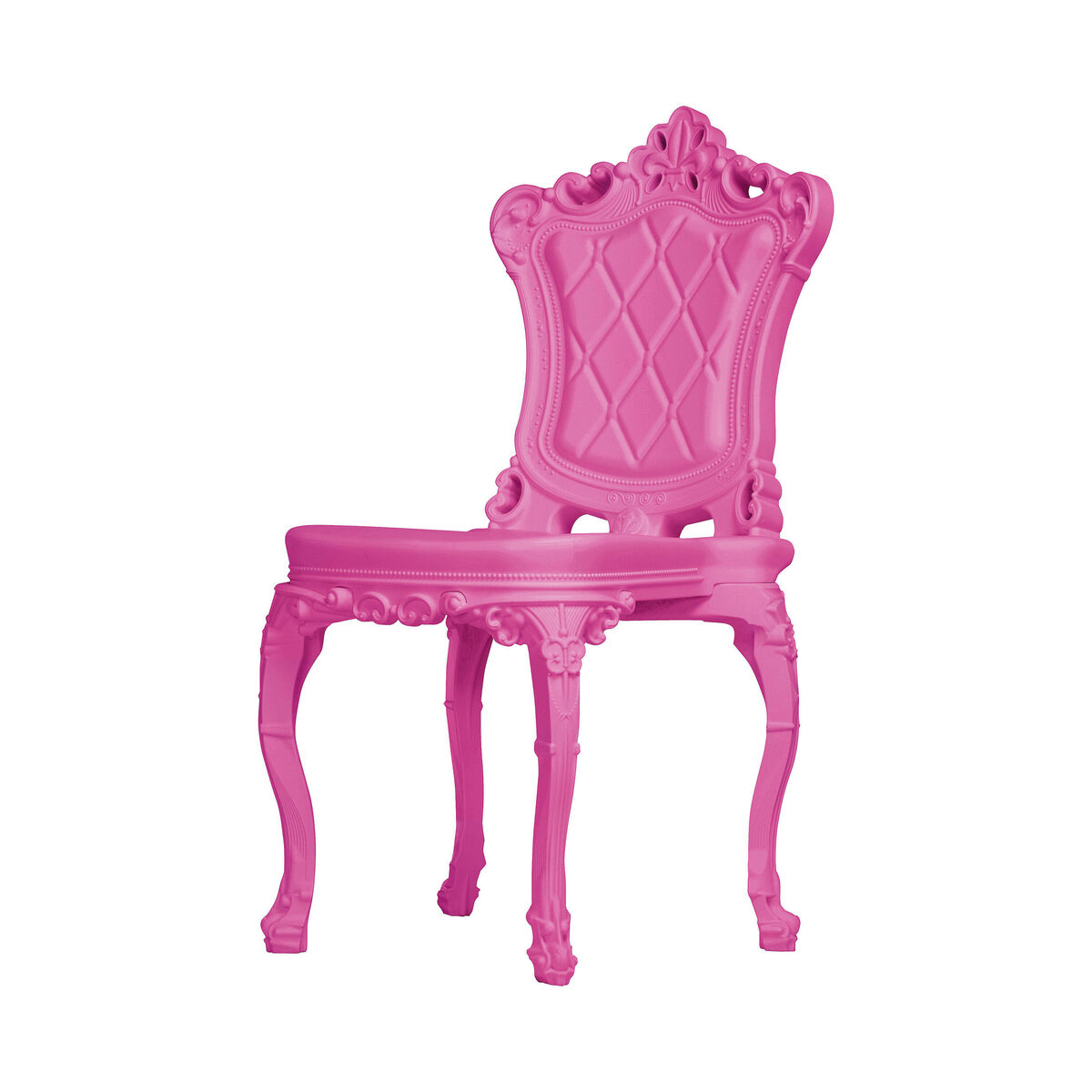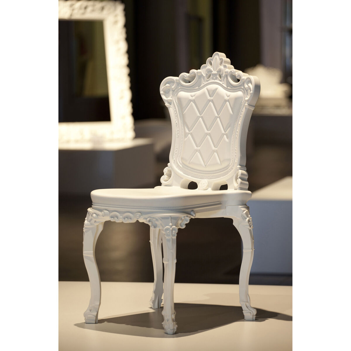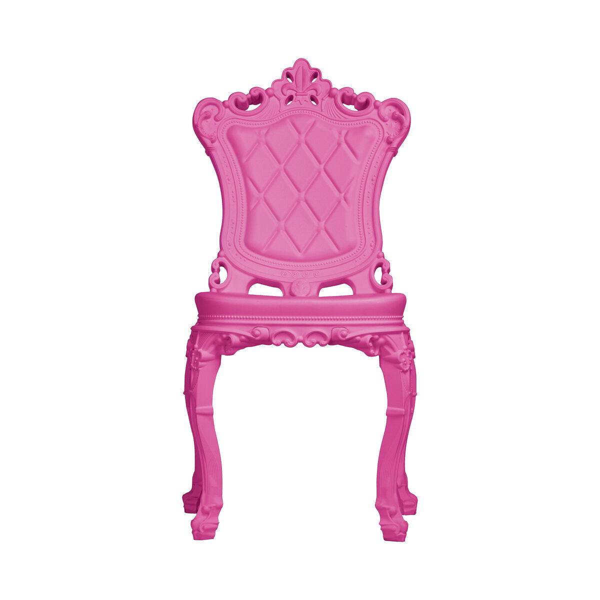 This chair is firmly 'royal' and perfect for creating a fun, quirky dining area, whether indoors or outdoors. Having been reigning supreme on our terraces and gardens with their cheerful and colourful collections, Italian publishing house Slide launches ″Design of Love″, a new, unbridled fantastic brand! Created by the designer duo Graziano Moro and Renato Pigatti, this range displays a Baroque style reminding us of our buried childhood dreams... Princess thrones, oversized mirrors, playful accessories... A truly fresh air in the world of outdoor furniture! This collection, entirely made in Italy, will seduce those who feel like bringing pieces with strong identity to their exteriors, mixing a funny style and Rococo inspiration. The entire collection is made of polyethylene and is therefore highly UV- and bad weather resistant, and can be cleaned by with one single movement of sponge. All items are available on request in a vast array of other colours and in lacquered versions: feel free to contact our customer service.