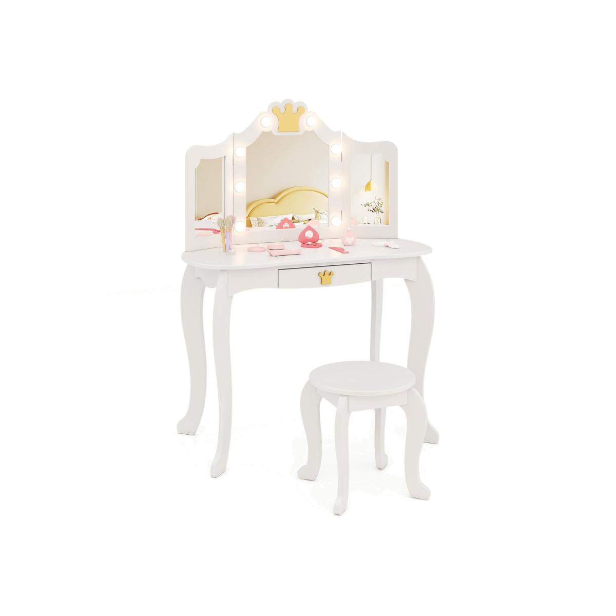 Delight your little one with our cute vanity table set! The kids vanity set features crown shapes to appeal to children, which is perfect as a gift for birthday or Christmas. Designed with non-slip foot pads and anti-toppling device, the kids pretend play vanity is strong enough to offer long-lasting support. Children can sit on a stool and check their looks through the tri-folding acrylic mirror. The top can be removed to turn this vanity table into a writing desk. Furthermore, the large drawer keeps kid's items within reach.
