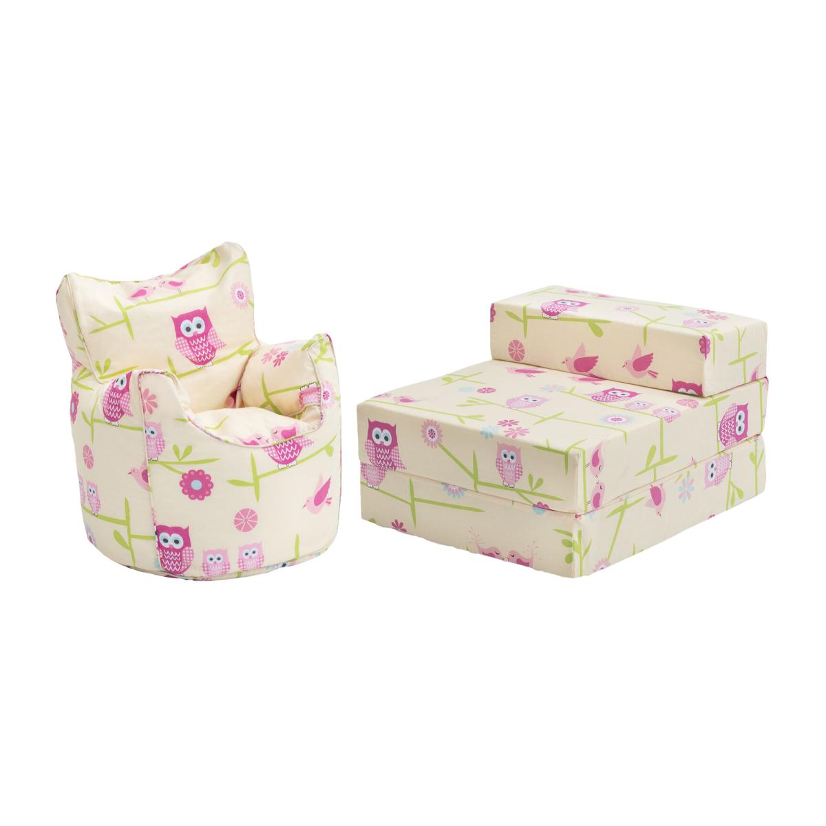 Printed Kids Bean Bag Armchair and Folding Z Bed Mattress - Owls
