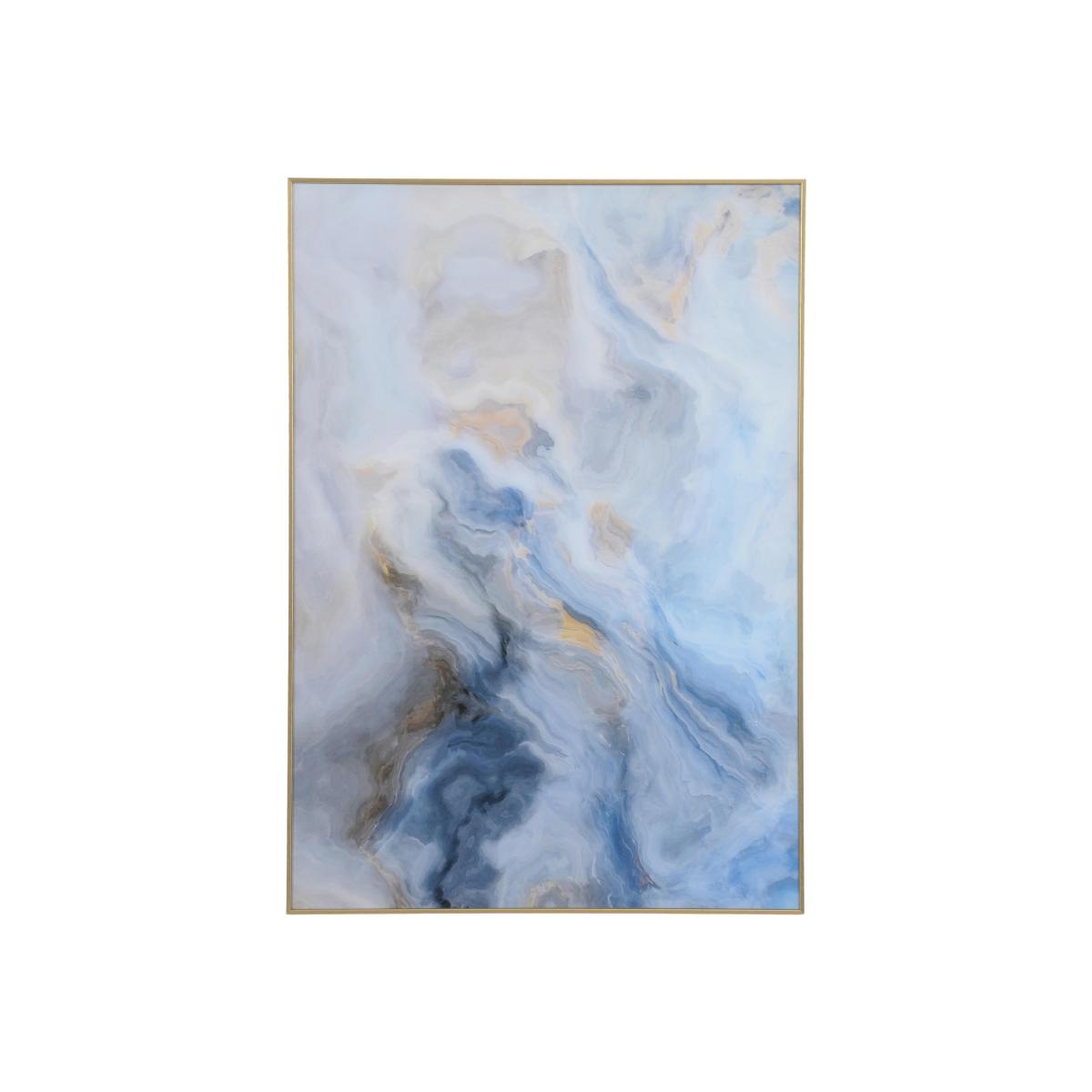 This beautiful piece of glass wall art features the organic natural swirls of marble. The blue and gold palette feels at home in both classic and contemporary spaces. Why you'll love it. Marble-like swirls of blue and gold dominate this stunning piece of glass wall art. Abstract contemporary style. Mesmerising depths of form and colour. Narrow gold-toned frame is simple and elegant. This piece of glass wall art is part of the Furniture Village accessories collection. What you need to know. Wall fixings not included. Dimensions. Height: 5 cm (2 in). Depth: 106 cm (42 in). Width: 76 cm (30 in).