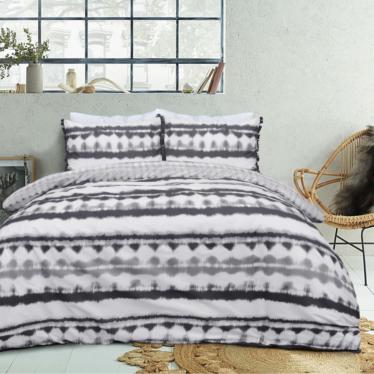 Printed Reversible Polycotton Tiedye Tassel Trim Duvet Cover With Pillowcases - Black