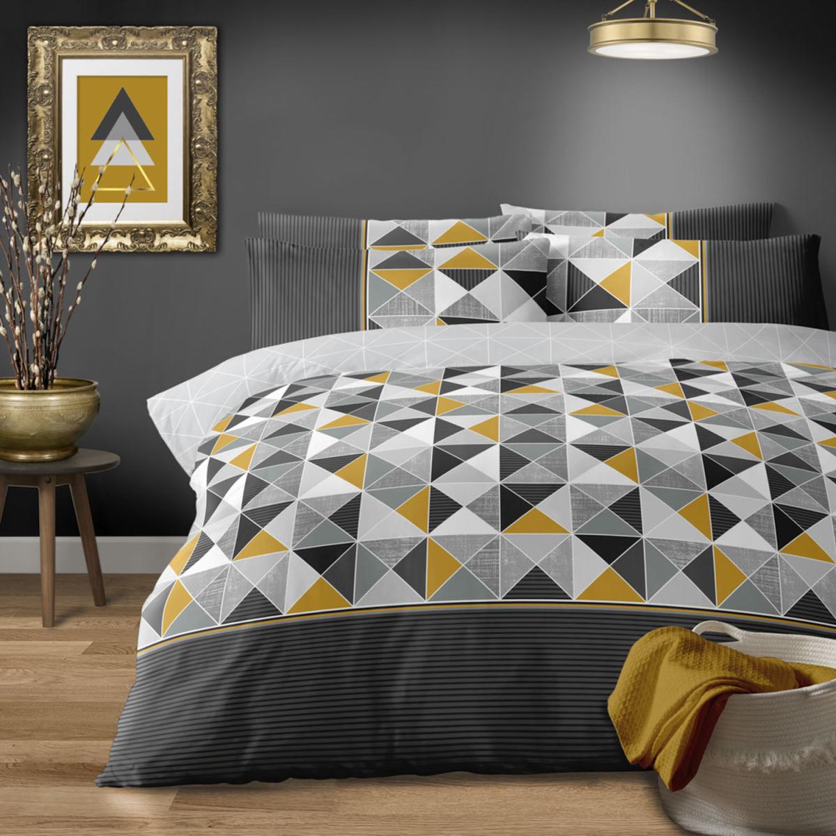 I really like this duvet cover set-its geometric design with black, grey, and hints of mustard offers a modern, versatile look that works well in contemporary or minimalist interiors. The green accent adds a refreshing touch, making it suitable for rooms with a hint of nature-inspired palettes. When styling, pair it with neutral or darker bed linens to let the pattern stand out, and introduce textured cushions or throws in solid colours for added depth. Its practical pattern also helps hide minor spills or wrinkles, making it a smart choice for everyday use. Overall, it's great for achieving a stylish yet practical bedroom aesthetic.