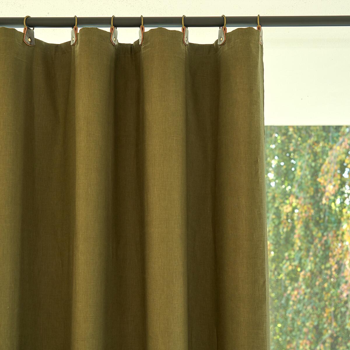Private washed linen blackout curtain with faux leather loops. Simple and chic, this washed linen curtain softens and takes on a very sought-after subtle crumpled look. Product Details • 100% linen • Washed linen • 100% viscose flocking • Lining 100% polyester Finish • Ready to hang with finished hem • Leather-effect loops with aged metal rings diameter 4cm. Care instructions • Washable at 40°CSizes • Width 140 x Drop 180cm • Width 140 x Drop 220cm • Width 140 x Drop 260cm • Width 140 x Drop 350cm