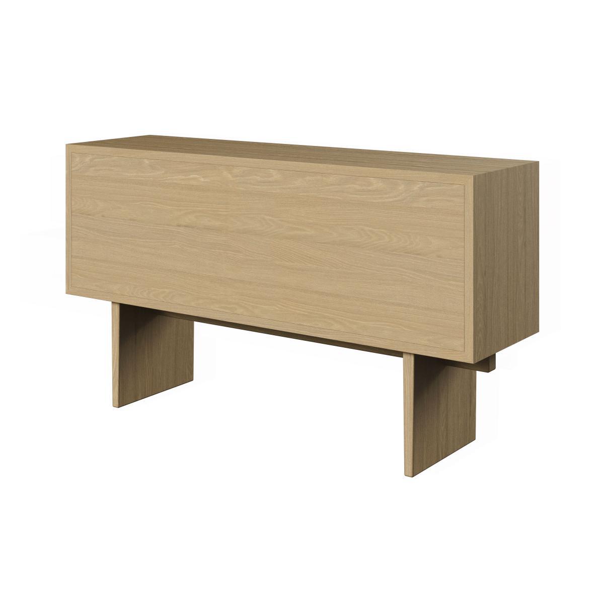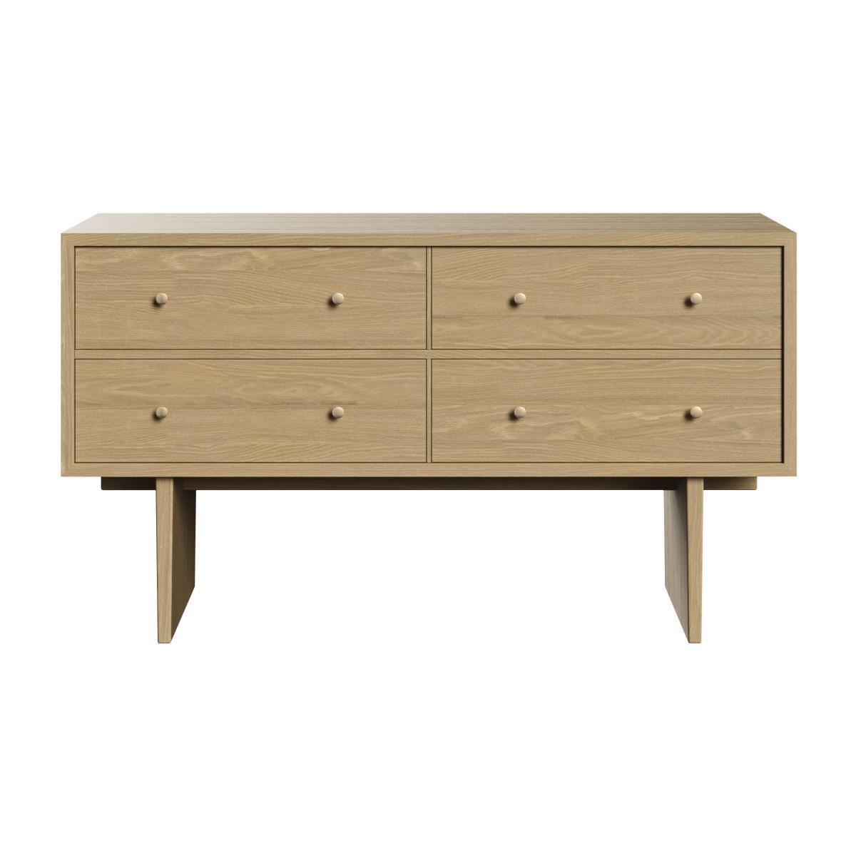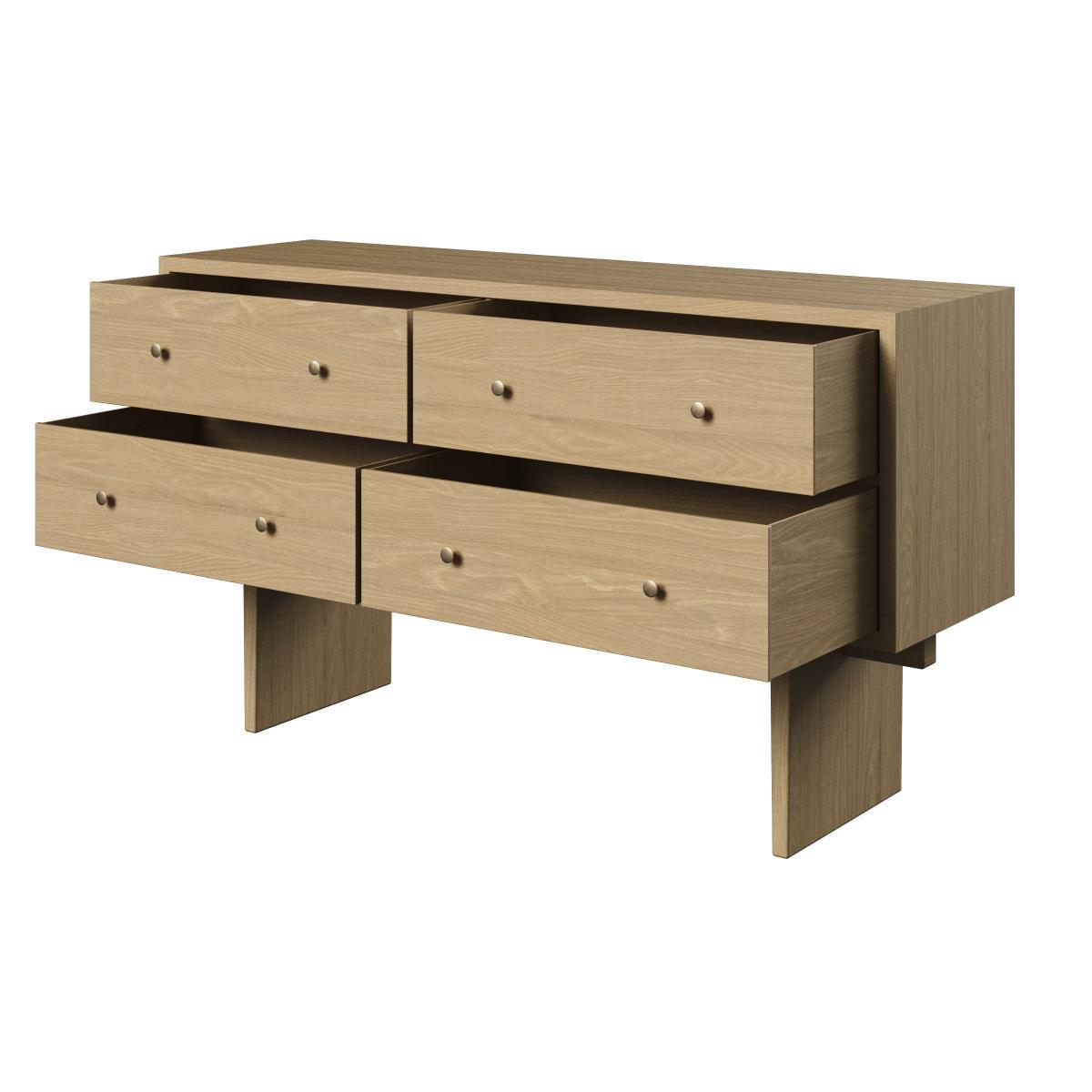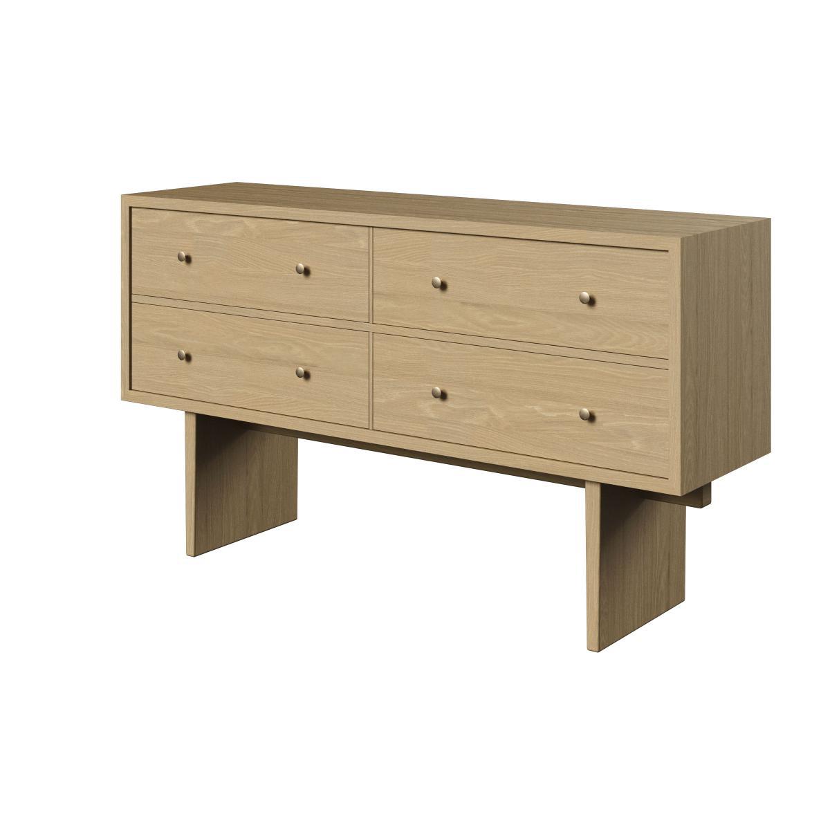 Danish design house Gubi continues to bridge the gap between eras with a new collection that stands the test of time. To design the Private collection, Danish studio Space Copenhagen was inspired by Japanese craftsmanship, as Charlotte Perriand and Hans J. Wegner did before them. The Private collection is an exercise in purity, symmetry, balance and restraint. Subtly refined, Private furniture combines purity and elegance. This furniture reflects the culture of Japanese design where form must meet function without decorative, unnecessary or superfluous additions. A sensitivity that’s also expressed in the choice of materials (rigorously selected oak veneer), through a keen eye for detail and the influence of craftsmanship. The simplicity of form emphasises the prowess of traditional cabinetmaking. Private uses artisanal techniques, such as grain-matched veneers to ensure a perfectly even surface. Private uses the art of Japanese joints. This thousand-year-old art of Japanese carpenters consists of assembling the different pieces of wood without glue or nails, by simple interlocking. Private furniture is all supported by two large vertical panels connected by a horizontal wooden beam. This feat of structural engineering elevates each part, and allows it to support enormous weight, while still giving a feeling of lightness. The furniture with its rigorous straight lines is embellished with gilded brass handles. These solid, timeless pieces of furniture are made to last. Space Copenhagen: “For the Private collection, we took inspiration from the beauty of vintage Japanese storage furniture. The defining detail for each piece is a Japanese wood joint. We went for a simple, strong, recognisable language, focused on high quality, beautiful materials and refined, elegant details. ” The Private sideboard has four deep drawers arranged symmetrically.