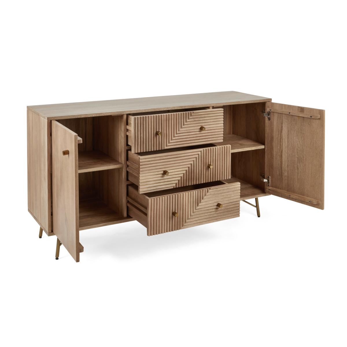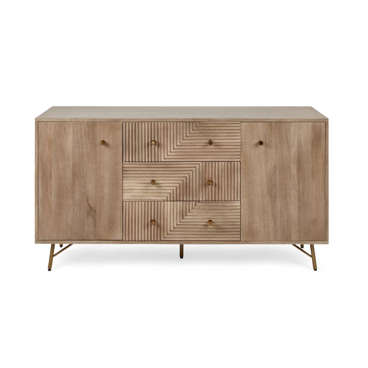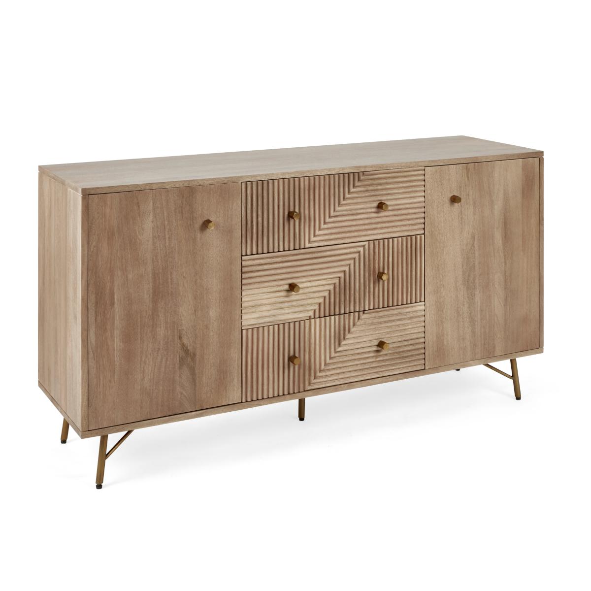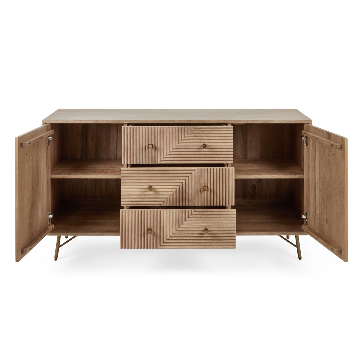 Dunelm Exclusive - Designed and Developed by Dunelm. This exceptional Priya Large Sideboard is a stunning way to store away your items and is sure to look beautiful in any room of the house. Crafted from solid mango wood using traditional joining techniques and finished with a unique grooved design to add wonderful texture as well as a gorgeous look. This sideboard features brass finished handles and legs that complement the wood material. With plenty of space to store away your belongings and keep your home tidy, the Priya sideboard offers 3 spacious drawers and 2 cabinet spaces with fixed shelving.