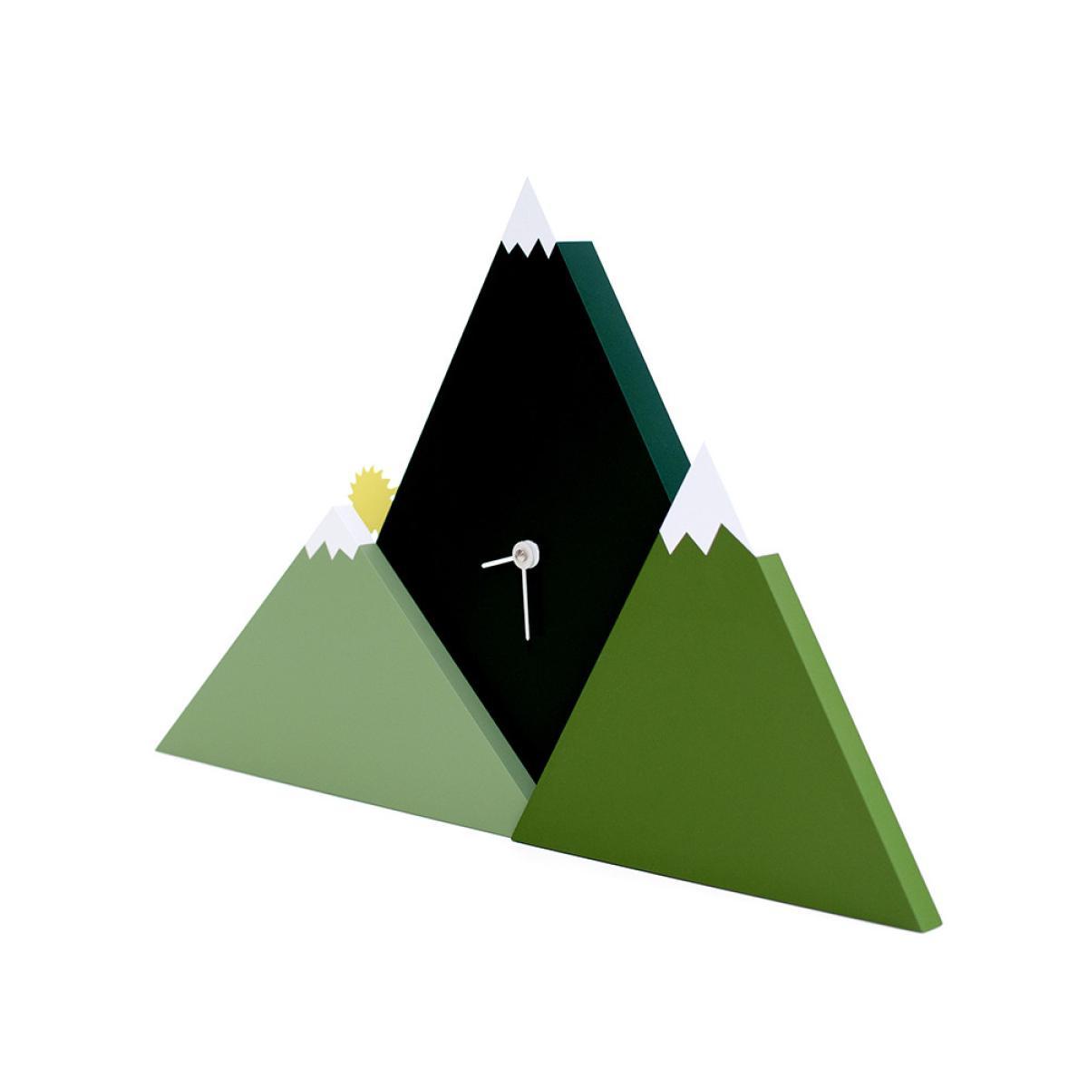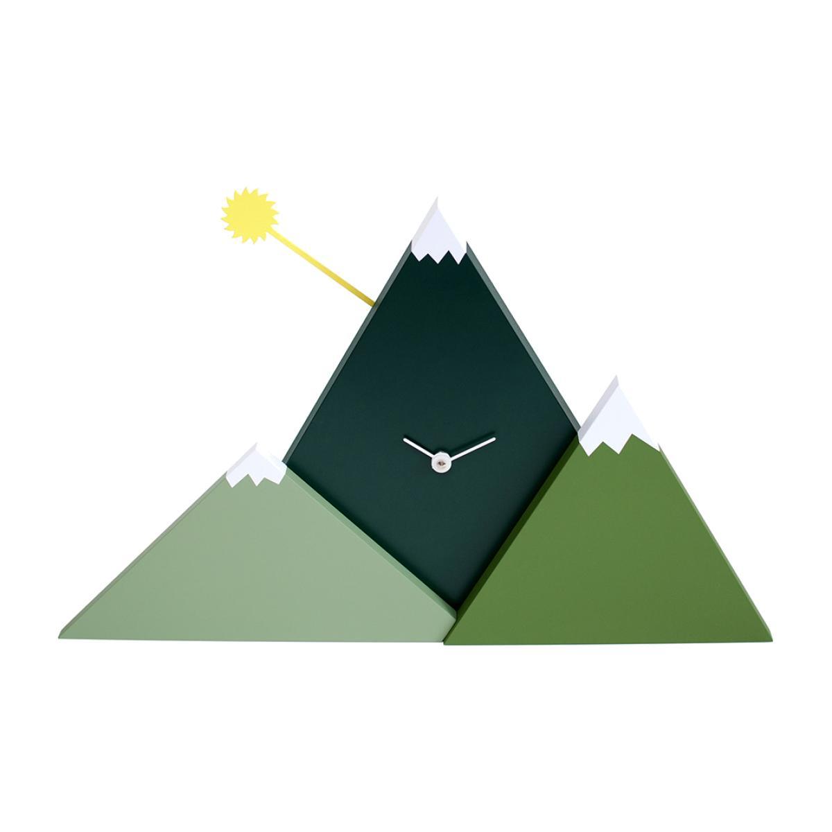 Chart the daylight hours in style with this Sunset clock from Progetti. Designed to be used as a desk clock, it features three mountain peaks in shades of green or orange and red. Made from varnished wood, it has a small dial on the central mountain and is finished with a bright yellow sun shaped hand which begins rising over the peaks at dawn and sets on the other side in the evening. Designed by Pagliaro & Saiano, it is a fabulous Italian design piece for any space in the home and there are many more timepiece creations available from Progetti. Please note, batteries not included.