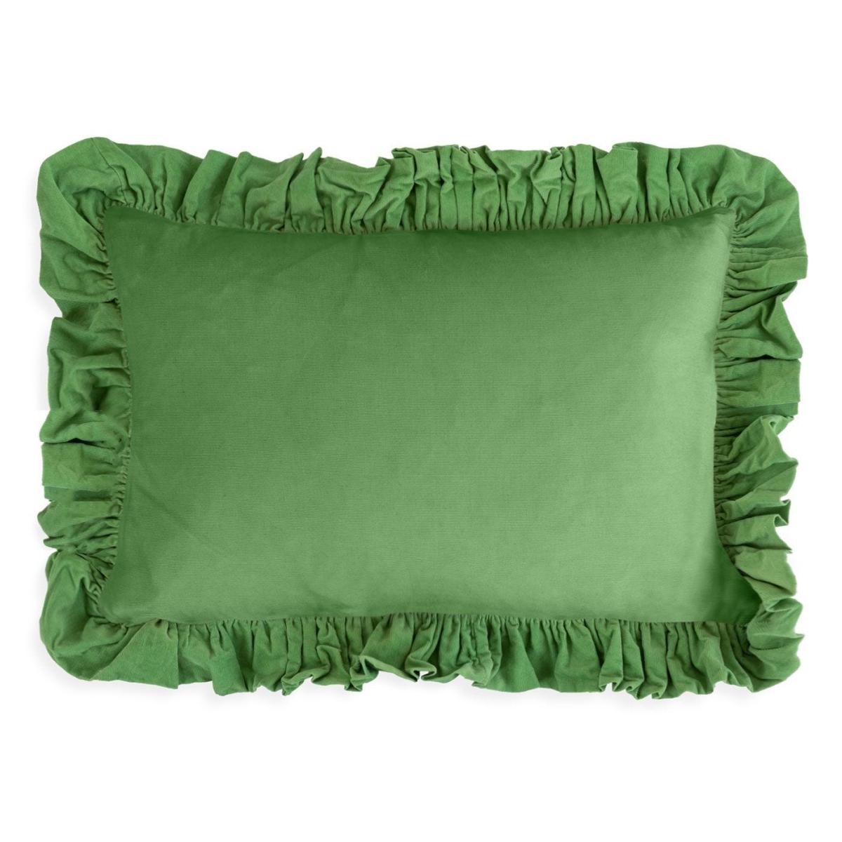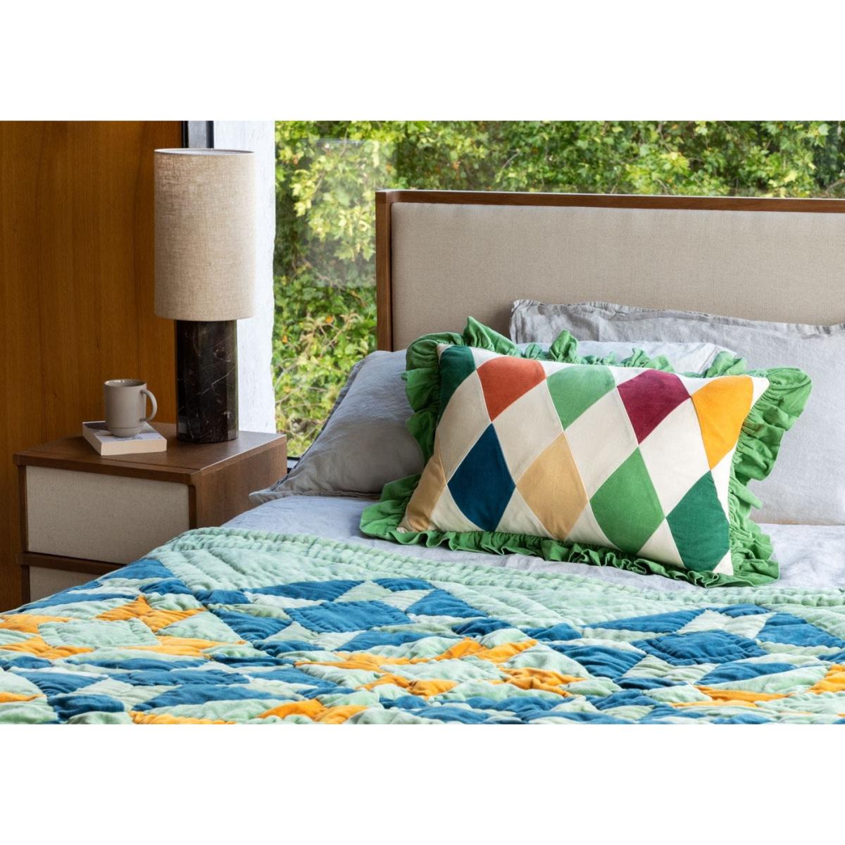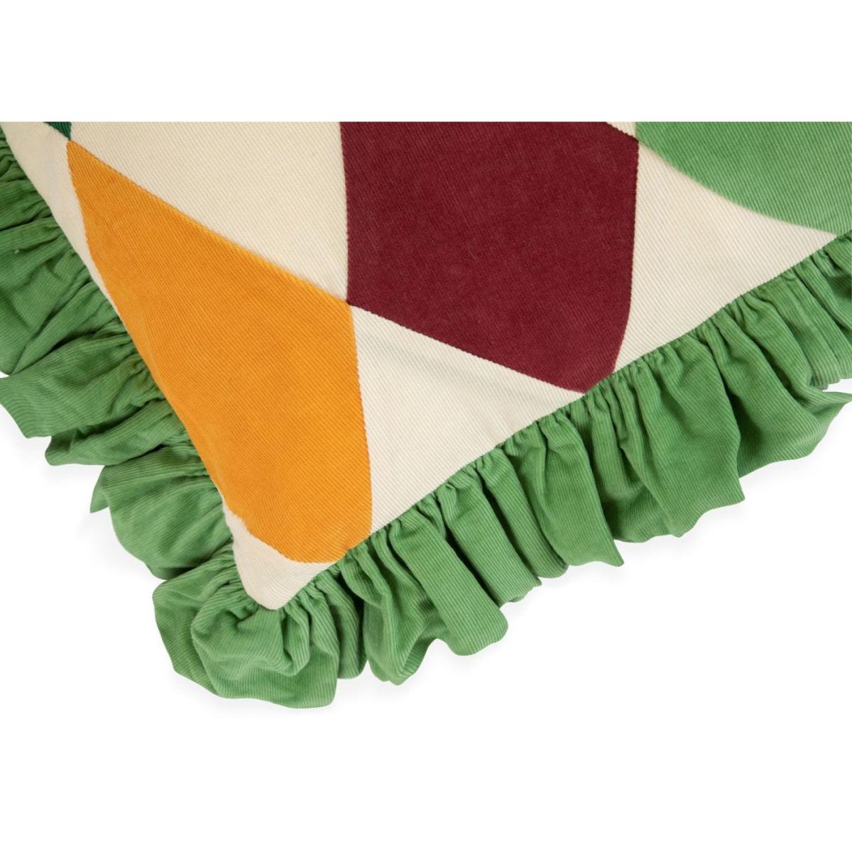 This cushion is a vibrant, playful piece that works particularly well in lively, contemporary interiors or eclectic schemes. I love the bold harlequin pattern combined with the pistachio green ruffled border-it adds a touch of colour and texture without overwhelming a space. It’s ideal for adding a pop of colour to a neutral sofa or bed, and can also be paired with other geometric or patterned cushions for a curated layered look. Practical styling tips include placing it on a plain fabric sofa to make it stand out, or mixing with more subdued tones for a fun, energetic vibe. Its size makes it versatile enough for both living rooms and bedrooms, perfect for injecting personality into your scheme.