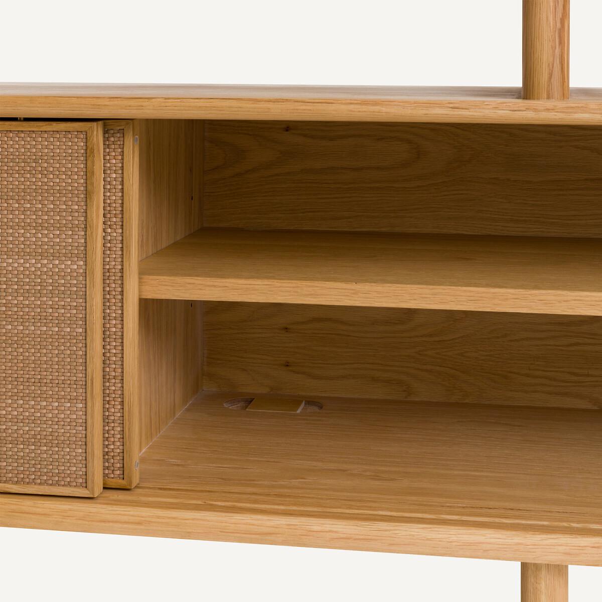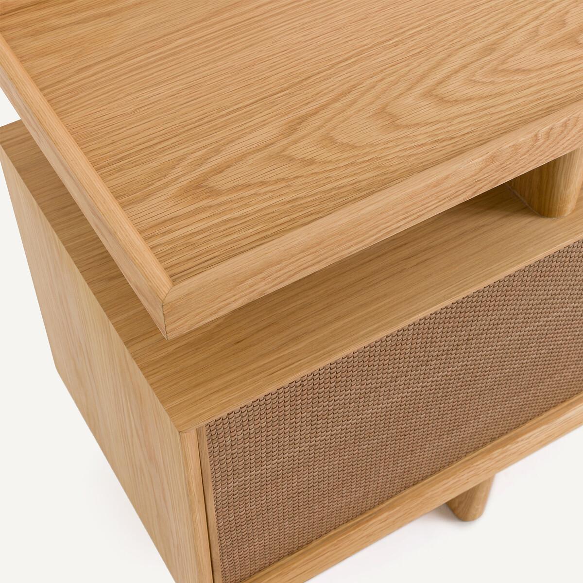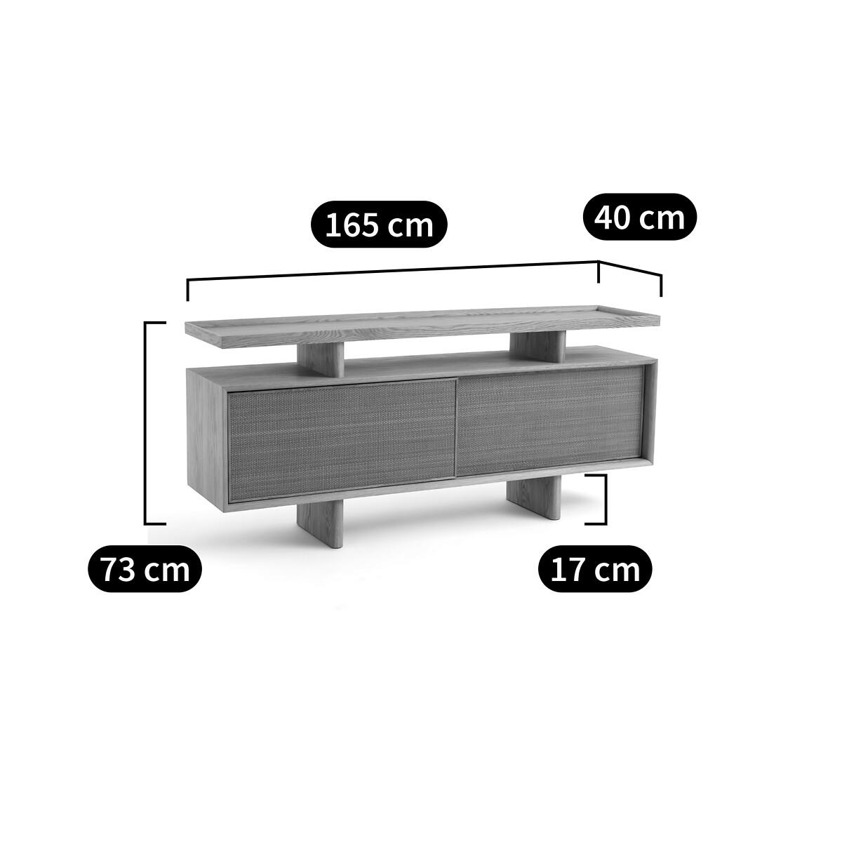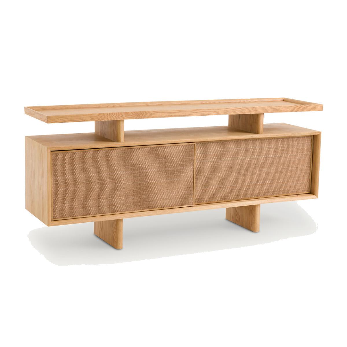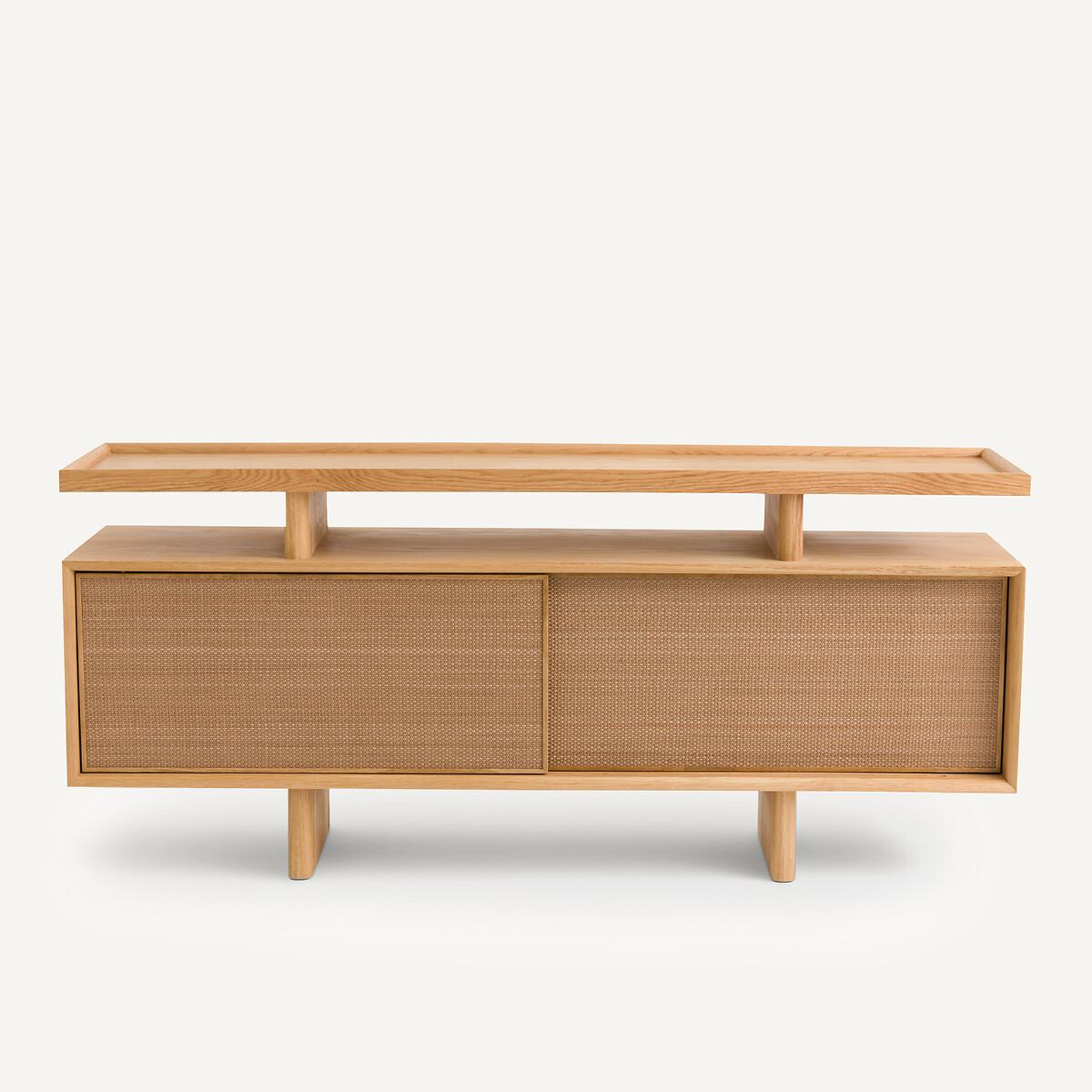 A sophisticated line. Propono combines an FSC® Mixed oak finish with facades covered in woven leather. Inspired by the modernist movement, this sideboard is composed of a box and a top with edges, enhanced by a base and spacers of the same wood. Behind its two sliding doors, it has a generous storage volume and two removable and adjustable shelves. An exclusive design by AMPM.Product Details • Unit and top in solid oak and FSC® Mixed oak veneered MDF, polyurethane varnish finish • FSC® Mixed certified solid oak base, polyurethane varnish finish • 2 sliding doors in FSC® Mixed certified oak veneered MDF, solid oak frame, polyurethane varnish finish, fronts covered in real woven leather (goat leather, immersion-dyed parts, chrome dyes) • 2 compartments behind doors • 2 removable and height-adjustable shelves • 2 cable entry slots. Dimensions • Length: 165cm • Height: 73cm • Depth: 40cm • Base height: 17cm. Usable space • Compartments behind doors (without shelves): L79 x H35 x D31cmDelivery:. Sold pre-assembled. It will be delivered to your door. Note! Please check that all access points are large enough to accommodate your delivery (doors, stairs, lifts). • WOOD FROM MORE SUSTAINABLY MANAGED FORESTS AND CONTROLLED SOURCES. FSC® Mix wood contains at least 70% FSC® certified and/or recycled wood, the remainder being FSC® controlled wood. Dimensions and weight of parcel • 1 parcel • L176 x H89 x D47cm. 75kg.