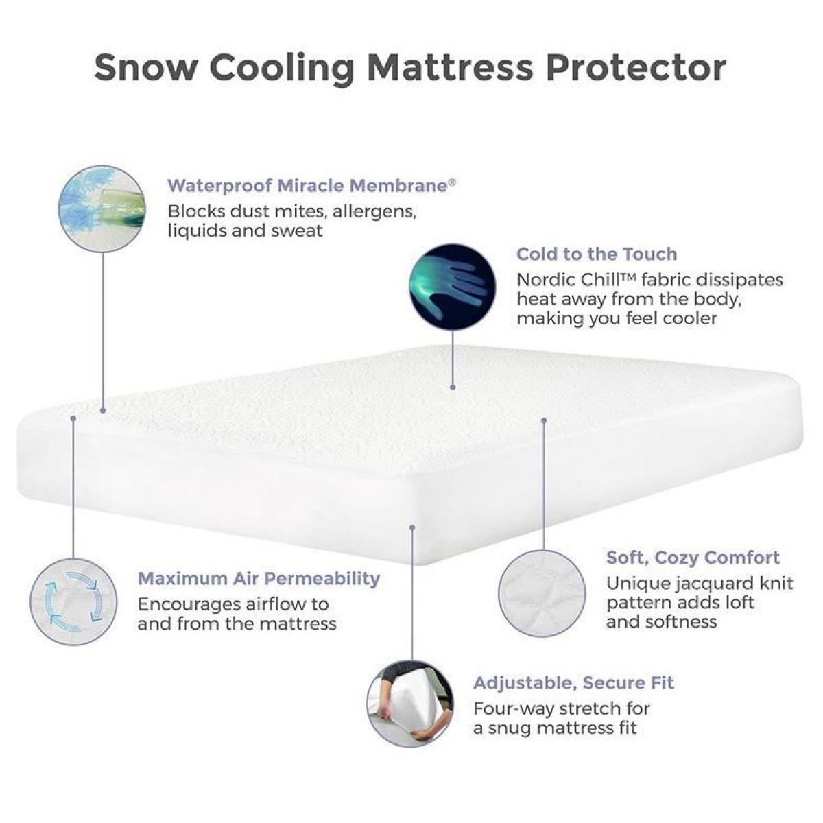 A unique design mattress protector, which doubles as a fitted sheet. Crafted in luxurious soft fabric, it has been designed with practicality and comfort in mind. Specifically tailored to mould to your body shape with its soft and supple cover combined with its allergen, waterproof barrier. Ensuring protection against any accidental spills whilst preventing your body's natural impurities from degrading your mattress, creating a hygienic sleeping environment and a better nights sleep. The Therm-A-Sleep Snow Cooling Mattress Protector with Nordic Chill helps you stay cool while you're sleeping and keeps your bed clean. The Nordic Chill cooling mattress protector fabric dissipates body heat up to 10 times faster than cotton, creating a cold sleep climate, even through your sheets. The Miracle Membrane barrier promotes a healthy sleep environment by protecting you from dust mites and other allergens that may lurk in the mattress, including mould, mildew, pet dander and pollen. Snug fit and easily removable fitted sheet-style to fit mattress securely Good Housekeeping quality tested and approved FDA Class 1 Medical Device Machine washable 15-year manufacturer's warranty All screens vary in colour reproduction and whilst every effort has been made to display the colour as accurately as possible it is for guidance only.