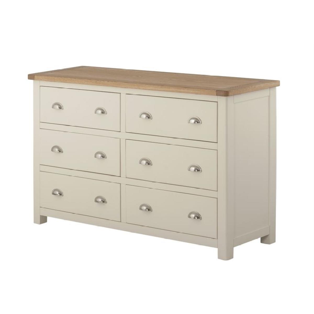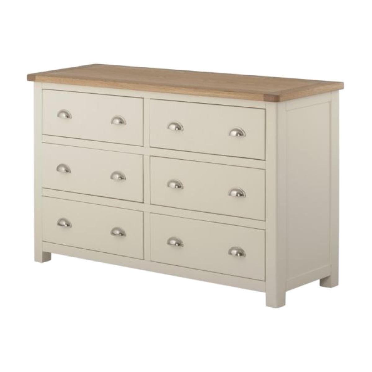 This modern bedroom furniture collection constructed from Oak and Oak veneer and finished with contemporary brushed nickel D-cup handles. Ideal for traditional or contemporary bedrooms and available in various drawer configurations, these sturdy and roomy drawers will make a welcome addition in your bedroom. Oak and Oak veneer Cream painted finish Brushed nickel D-cup handles 6 large drawers Dimensions: 125cm (W) x 40cm (D) x 78cm (H)