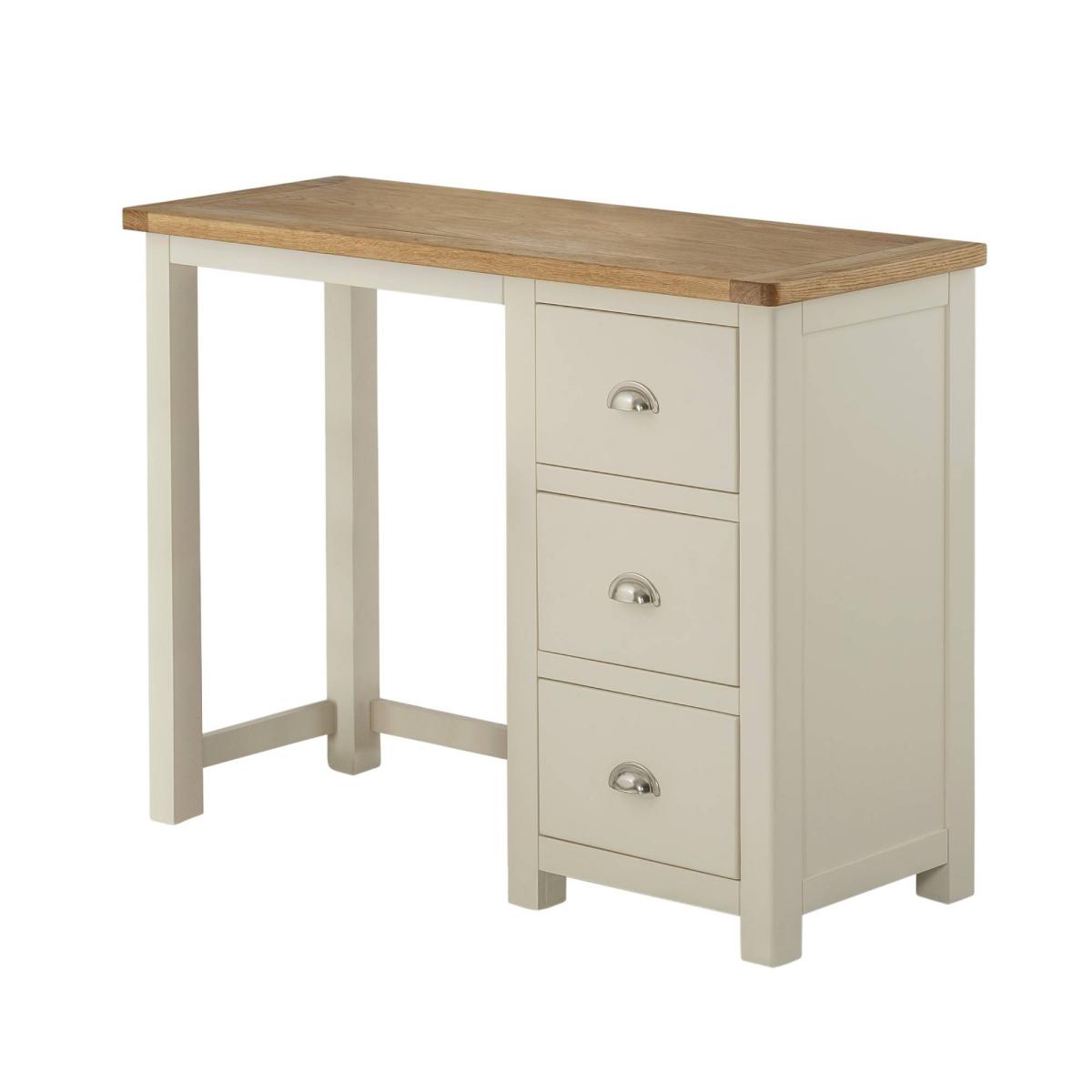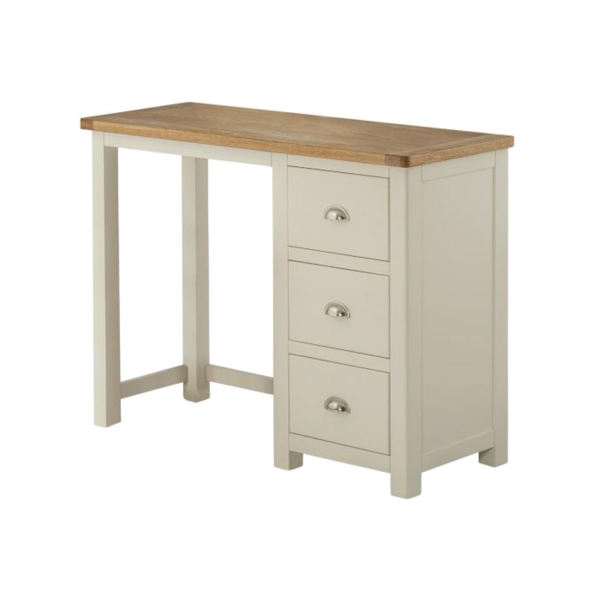This modern bedroom furniture collection constructed from Oak and Oak veneered tops with a pine and man-made board carcass, finished in a crisp cream colour paint finish with contemporary brushed nickel D-cup handles. Ideal for traditional or contemporary bedrooms this dressing table complete with 3 sturdy and roomy drawers will make a welcome addition in your bedroom, keeping all those essentials close by and out of sight until they are required. Oak and Oak veneer Cream painted finish Brushed nickel D-cup handles 3 drawers Dimensions - 107cm (W) x 40cm (D) x 78cm (H)