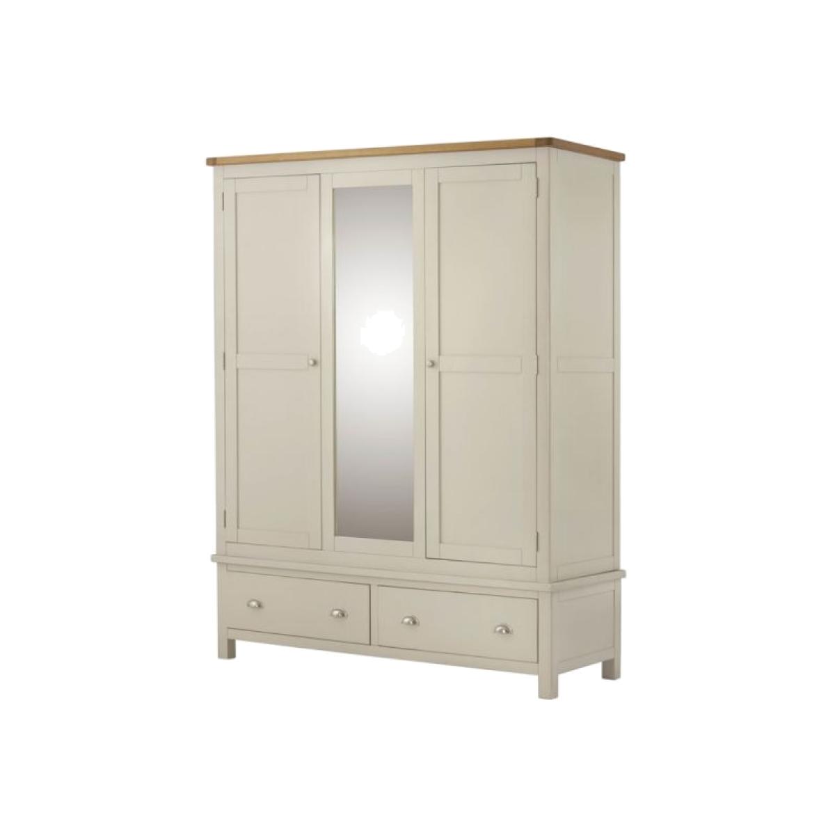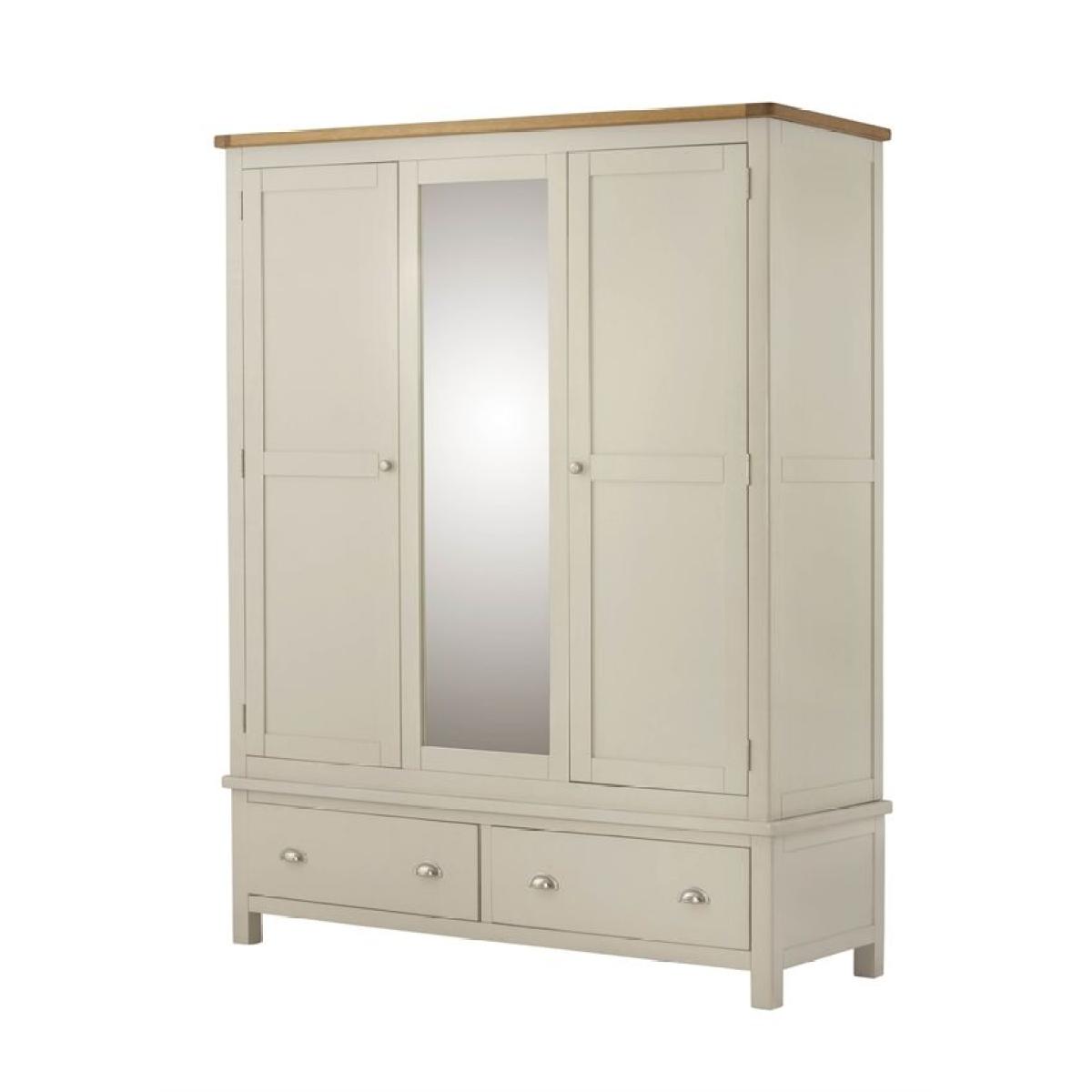 This modern bedroom furniture collection constructed from Oak and Oak veneered tops with a pine and man-made board carcass, finished in a cream colour paint finish with contemporary brushed nickel D-cup handles and round knobs. Ideal for traditional or contemporary bedrooms, there is a wardrobe to suit all setups, available either as a full height hanging robe or as a wardrobe and roomy drawer combination. These wardrobes will make a welcome addition in your bedroom. Oak and Oak veneer Cream painted finish Brushed nickel D-cup handles and round knobs 2 drawers, 2 doors, mirror centre panel Dimensions: 147cm (W) x 57cm (D) x 190cm (H) Assembly required