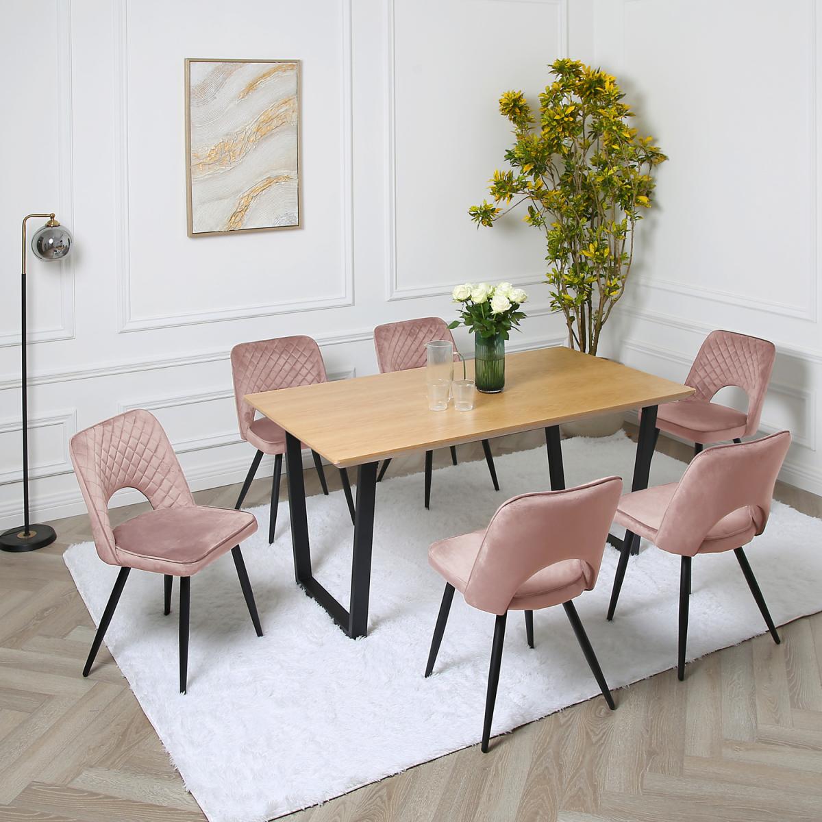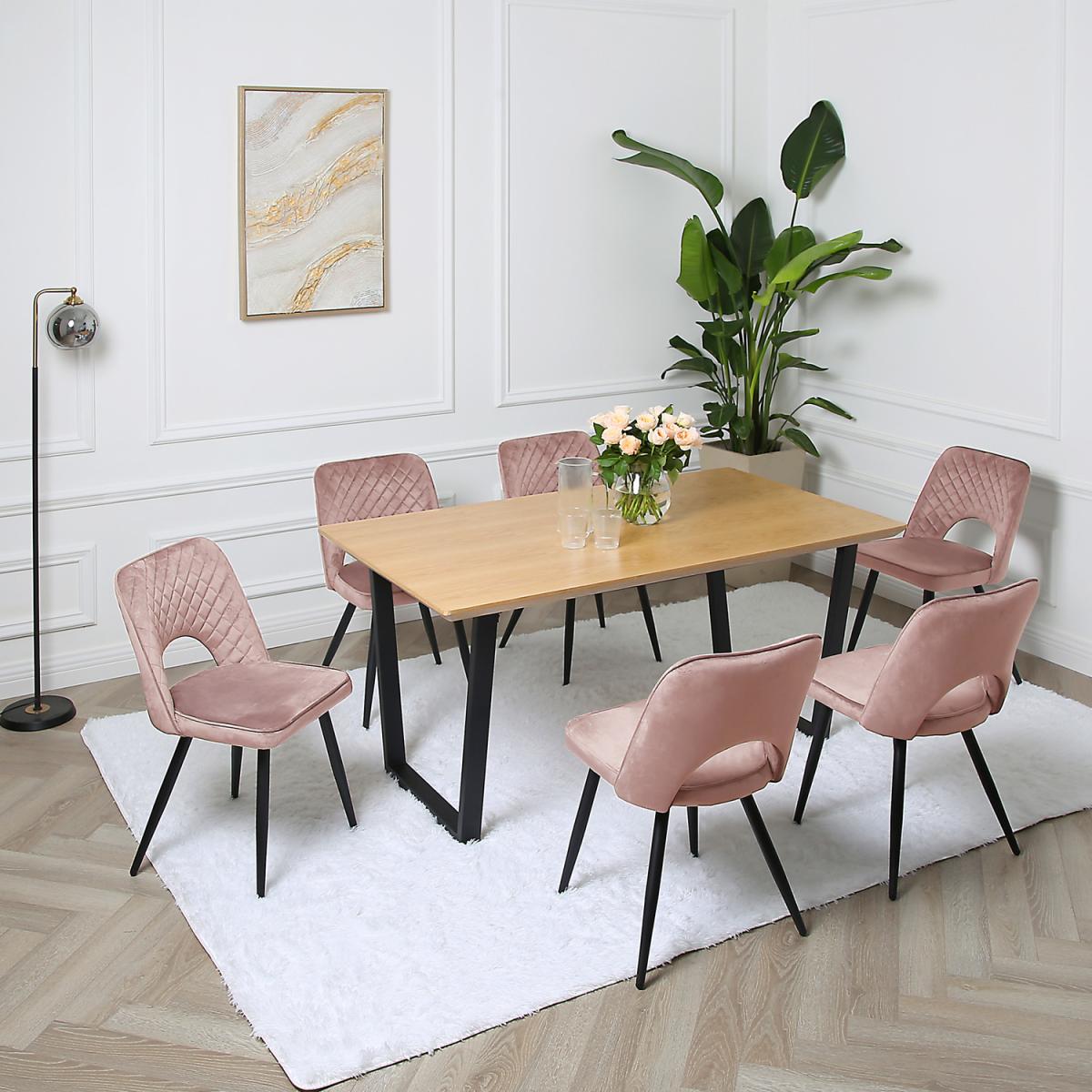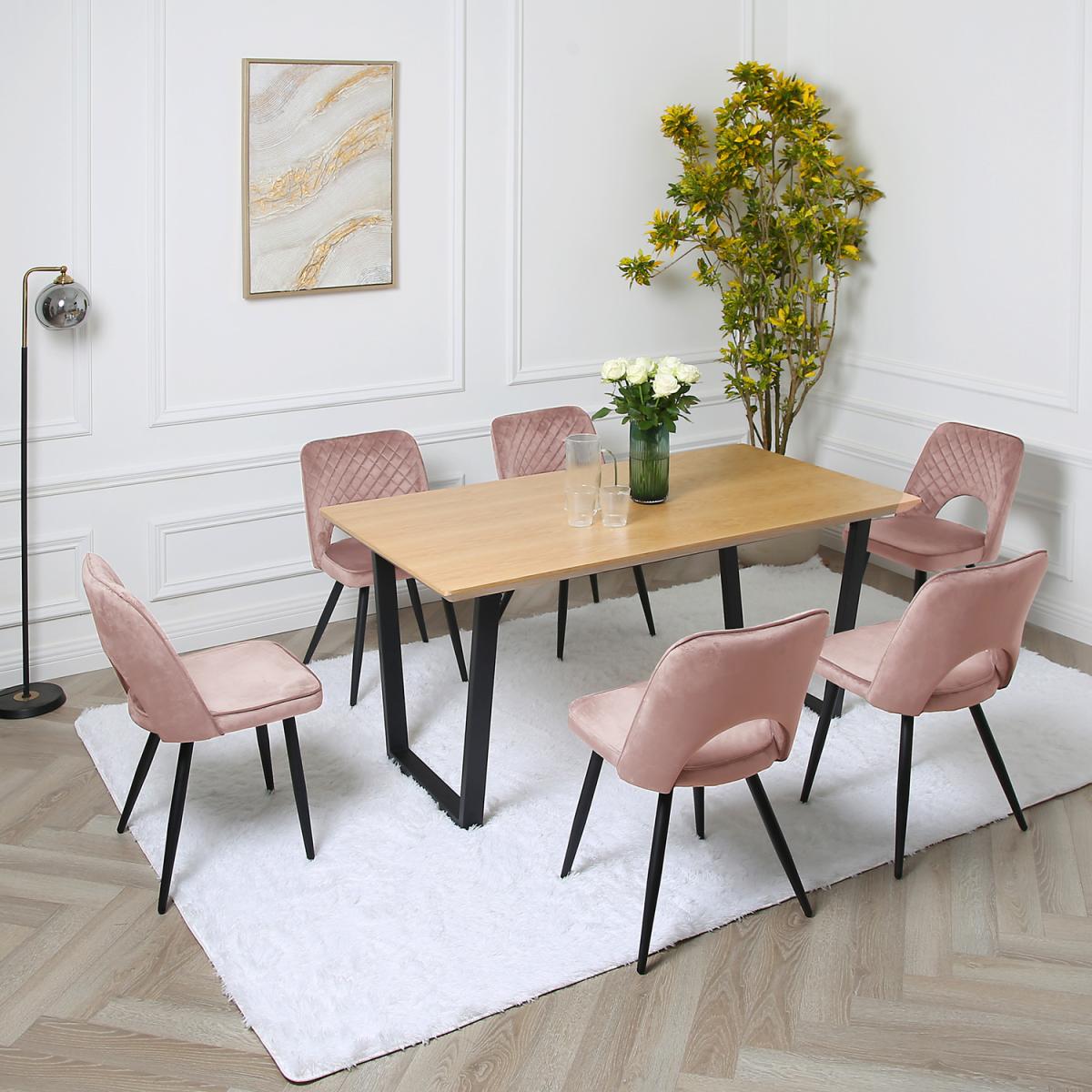 With its distinctive finish and colour combinations, this dining table with straight legs and chairs stands out and improves the aesthetic looks of any dining space. The dining table is crafted from MDF, while the dining chairs are tastefully wrapped with high-quality and durable fabric. Beyond that, its highly comfortable to dine on, offering the perfect sitting height and comfort that allows you to enjoy a memorable dining experience. The hair frame is made with solid wood to support your weight, while the wooden dining table is supported by black powder-coated stands.