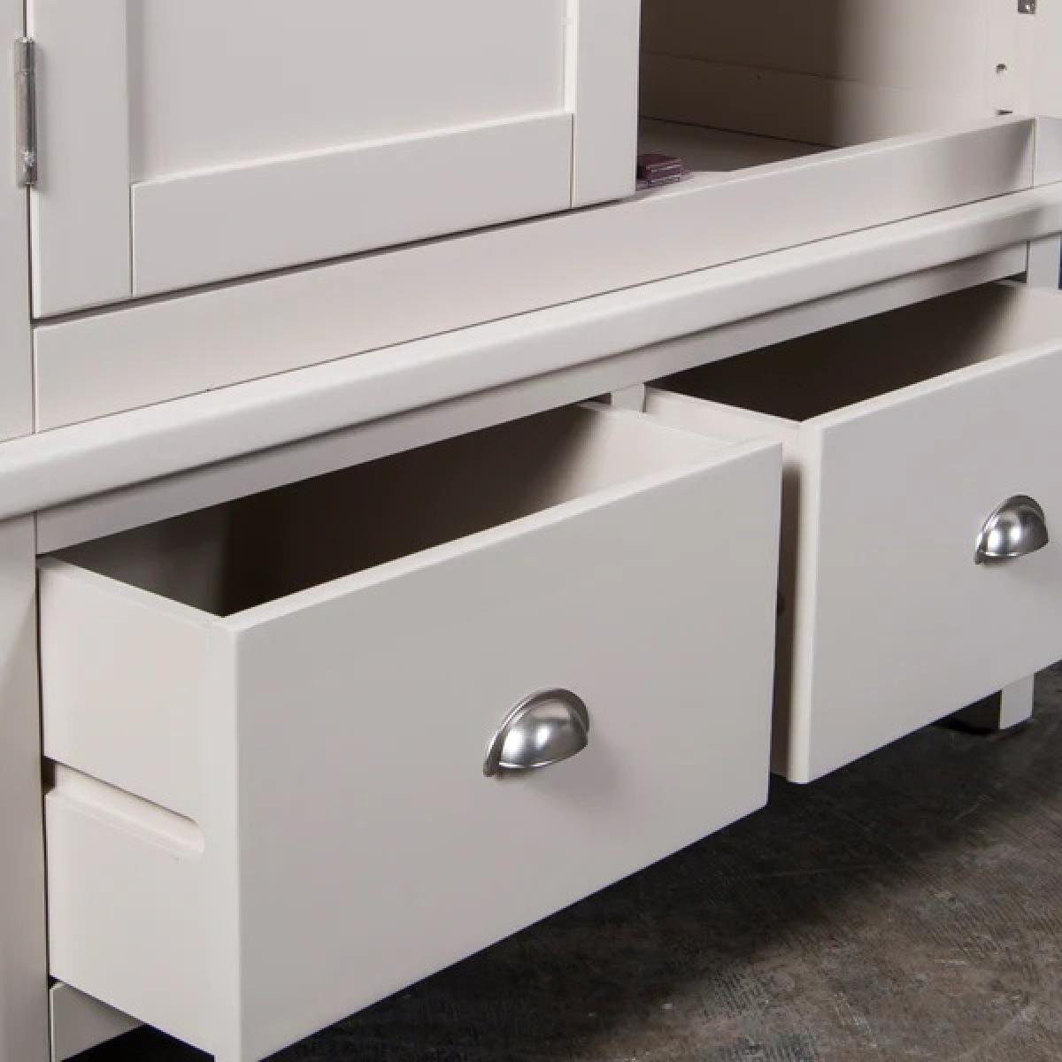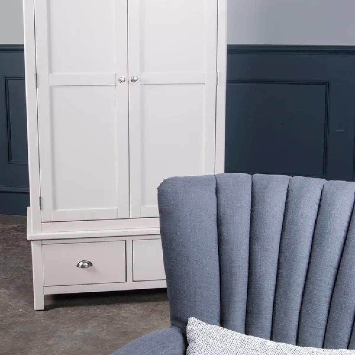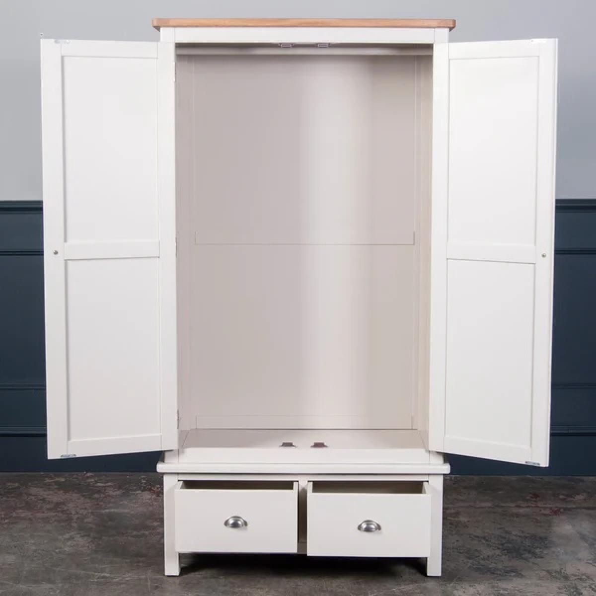 Provence Oak 2 Door Gents Wardrobe This modern bedroom furniture collection constructed from Oak and Oak veneer and finished with contemporary brushed nickel D-cup handles and round knobs. Ideal for traditional or contemporary bedrooms, there is a wardrobe to suit all setups, available either as a full height hanging robe or as a wardrobe and roomy drawer combination. This wardrobe has an open full width hanging space with rail and 2 small drawers. Handles chosen for the wardrobe drawers are inverted cup type, finished in a brass with matching knob style handles on the doors. Imprtant Information:Assembly required Key Features Solid & engineered oak Contemporary styling Double roller catches Brass cup handles & knobs Traditional butt hinges Wardrobe Dimensions: Width: 100cm Depth: 57cm Height: 190cm Please note: All screens vary in colour reproduction and whilst every effort has been made to display the colour as accurately as possible it is for guidance only. Selected images show the wardrobe in White, this product will be in Oak.