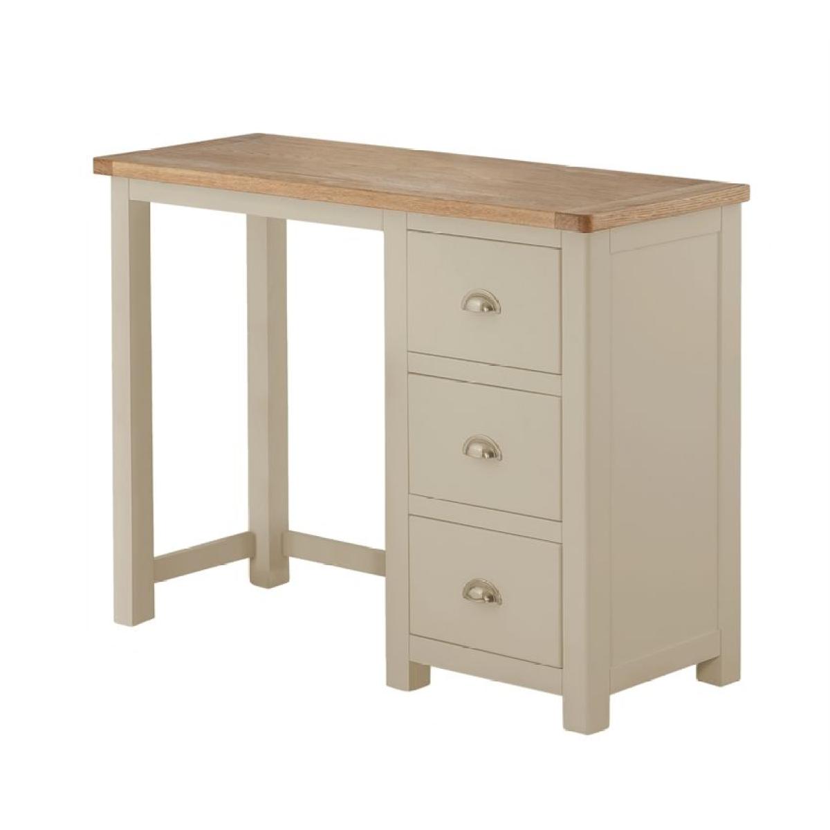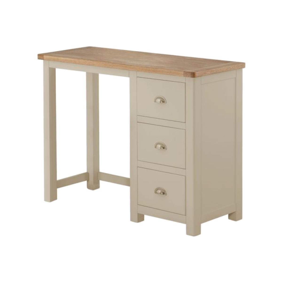 This modern bedroom furniture collection constructed from Oak and Oak veneered tops with a pine and man-made board carcass, finished in a crisp pebble colour paint finish with contemporary brushed nickel D-cup handles. Ideal for traditional or contemporary bedrooms this dressing table complete with 3 sturdy and roomy drawers will make a welcome addition in your bedroom, keeping all those essentials close by and out of sight until they are required. Oak and Oak veneer Pebble colour painted finish Brushed nickel D-cup handles 3 drawers Dimensions: 107cm (W) x 40cm (D) x 78cm (H)