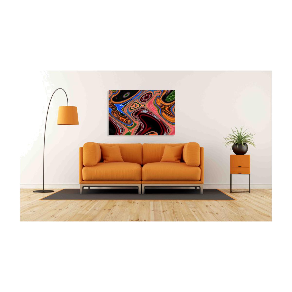 This piece is a fantastic pop of colour and energy, making it ideal for modern or eclectic interiors. The vibrant orange and bold, psychedelic design can create a focal point on a neutral wall, adding visual interest without overwhelming the space. It works particularly well above a sofa or sideboard in living rooms aiming for a contemporary vibe. For styling tips, try pairing it with warm-toned accessories or olive greens to enhance the colour palette. Keep other decor minimal to let the art stand out, and consider framing it with simple borders or leaving it unframed for a sleek, modern look. This print is versatile enough to inject personality into everything from a city apartment to a creative studio space.