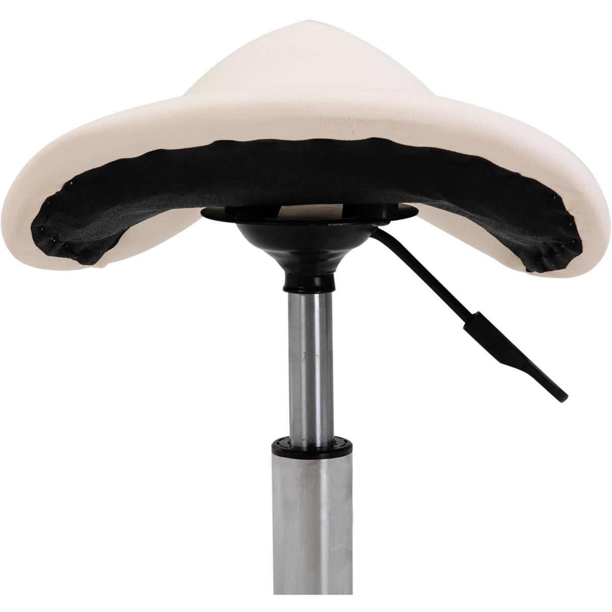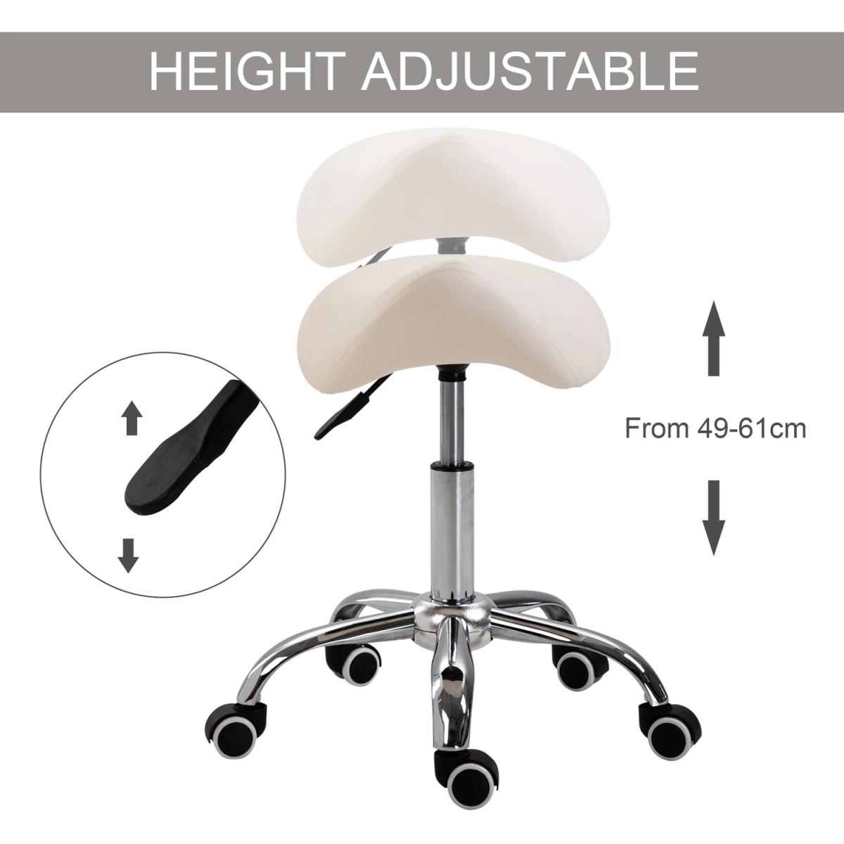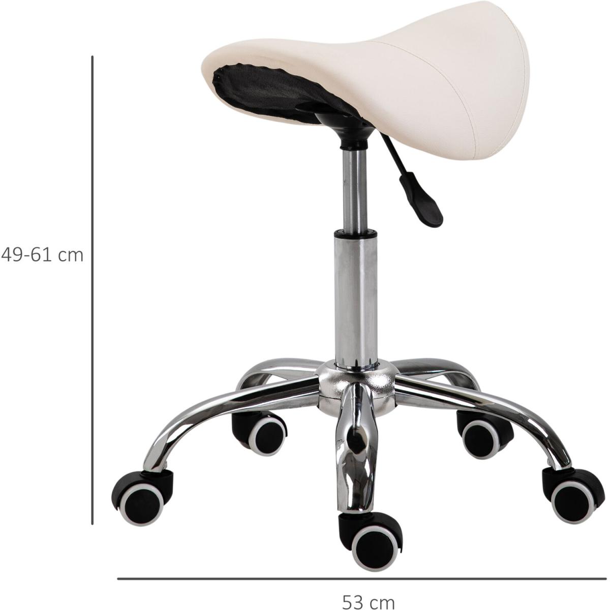 Ensure you have the correct posture whilst at work in your saloon/tattoo parlour, or even when you're at home with this saddle stool from HOMCOM. Using heavy-duty steel for a balanced and weighted base, it is made into a height-adjustable design, ranging from 49cm to 61cm for it to suit your needs and level of tasks. Curved in shape, the padded seat allows you to sit comfortably whilst keeping you supported and inclined to sit upright and in the correct posture, with faux leather upholstery for easy cleaning. It's finished with five wheels for you to move around easily when seated. The seat to do it all in.