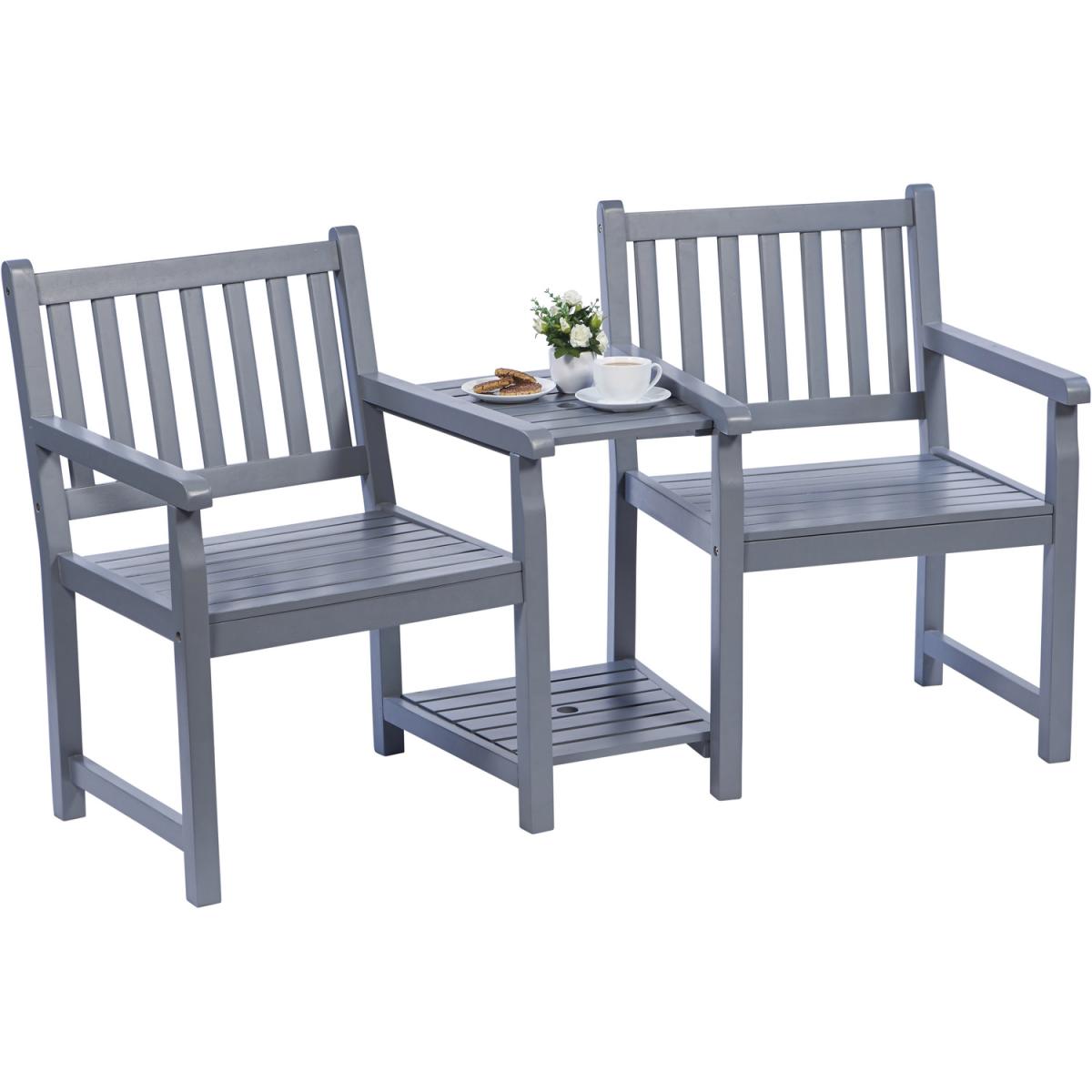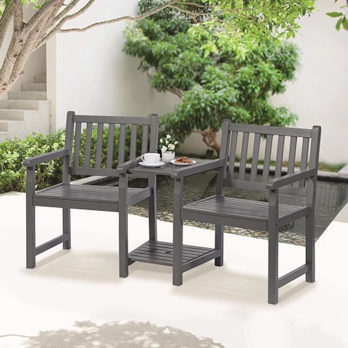Our new Danesford Duo Bench is crafted from managed and sustainable Acacia timber renowned for its strength, durability, and resilience to weathering. It is beautifully made from solid hardwood and coated in tough, weather-resistant PU paint in a choice of Sage Green and Slate Grey finish. A stunning outdoor centrepiece. This truly attractive companion seat can be placed in a favourite spot in the garden to simply relax and enjoy those precious moments together. Generously proportioned seats measuring W54 x D46cm with a seating height of 44cm. The adjoining table with a shelf measures 42.5cm at the rear and 31.5cm at the front with a depth of 47.5cm providing ample space for drinks and snacks. The duo bench has a 35mm parasol aperture to accommodate standard parasols.