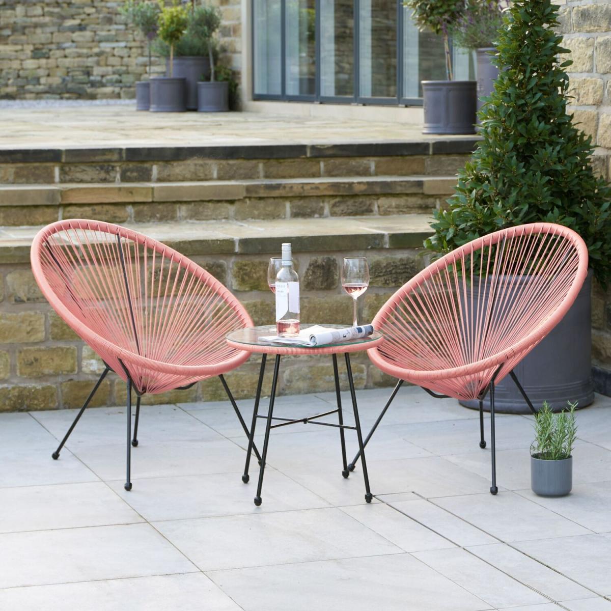 I love this pink bistro set for its vibrant colour and modern yet versatile design. It’s perfect for adding a pop of colour to a garden or balcony, especially in contemporary or sunny interior styles that embrace bold accents. The minimalist wire-frame chairs pair well with both neutral and pastel palettes, making it easy to style with cushions, throws, or even floral arrangements for outdoor dining that feels inviting and fresh. Practical styling tips include adding a small outdoor rug underneath and decorating nearby planters or lanterns to create a cosy, inviting space for relaxing or entertaining. Its playful hue makes it a great focal point for laid-back, cheerful settings while remaining compact and easy to move around.