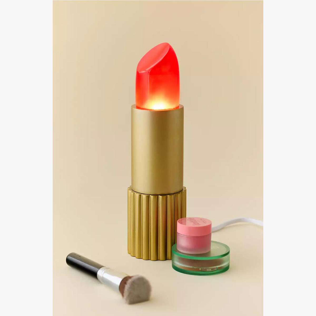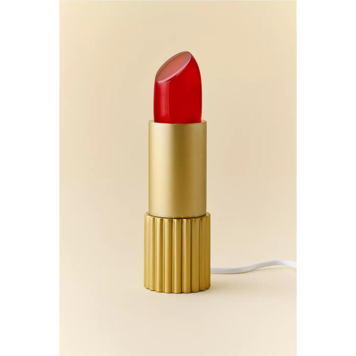 Playful table lamp shaped as a lipstick. Features a gold-tone base with ridged detailing and a translucent red top emitting a warm glow. *Bulb not included. * **Content + Care** \- Iron, Plastic \- Bulb type E14 1XMA X 2W LED (Not included) \- Wattage/Voltage: 220V-240V \- EU & UK plug \- Wipe clean **Size** \- Overall dimensions: Dia: 7.6cm x H: 26.6cm \- Base dimensions: Dia: 7.6cm x H: 8.4 cm \- Cord length: 7 ft \- Weight: 2.9 lbs