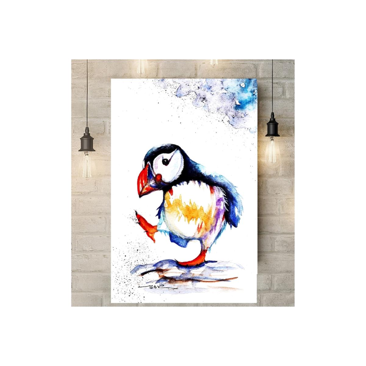 Inspired by the beauty of nature, Be Coventry originally painted this whimsical scene of a Puffin in professional watercolours. Now recreated in print on a box canvas, this artwork will enhance any room in your home. The watercolour design is printed onto 260gsm Matte Polyester canvas, and attached to quality pine timber. The canvas is taped on the rear and is supplied with a wall-hanging kit.
