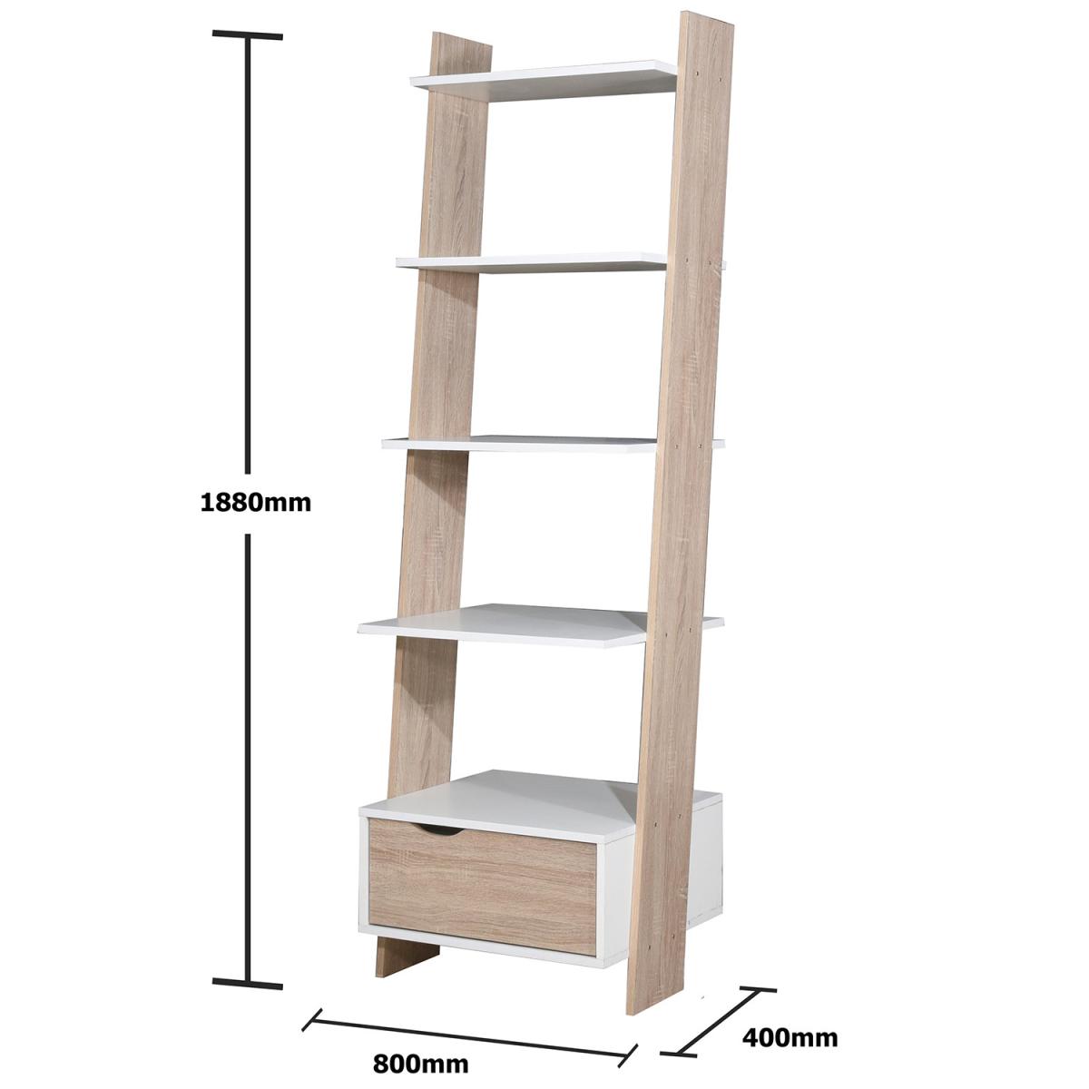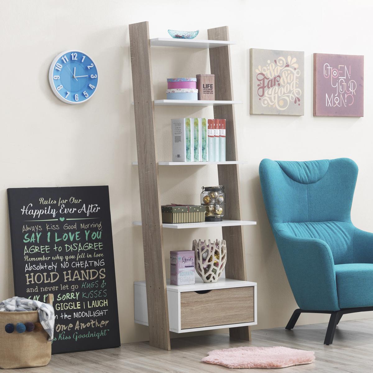 Save space and stay organized with the Ladder Bookshelf. This leaning ladder bookshelf with a drawer is both unique and practical, it features five graduating open shelves, providing ample room to display pictures, decorative pieces or your book collection. Scandinavian Style. Charming light & oak-effect accents add to the appeal.