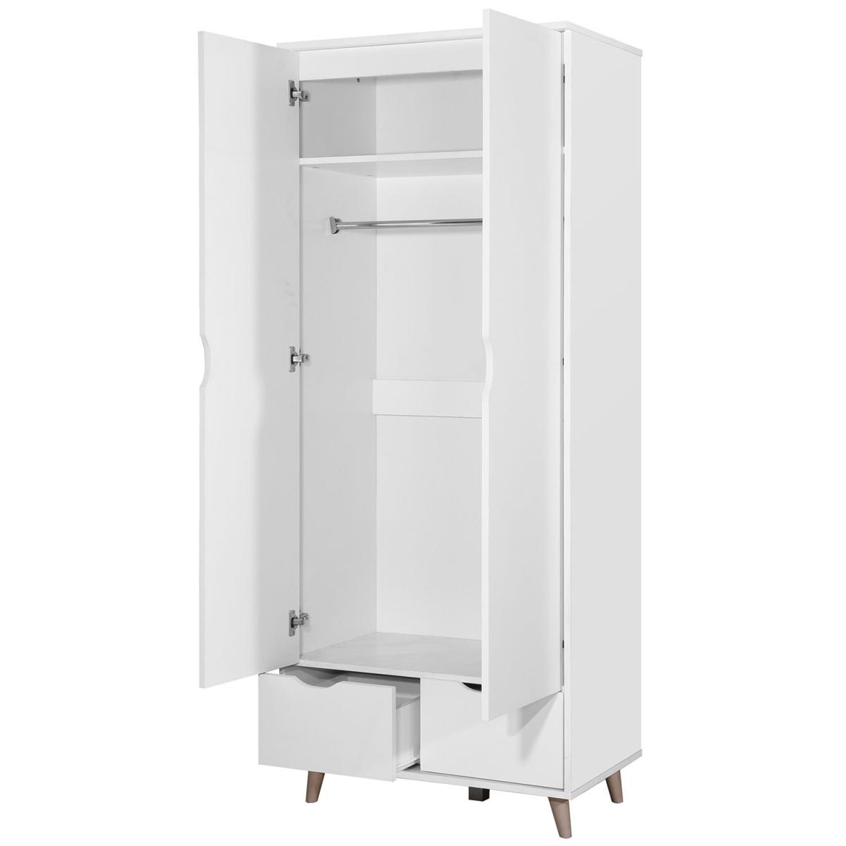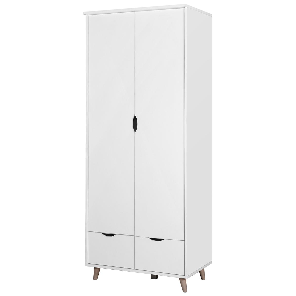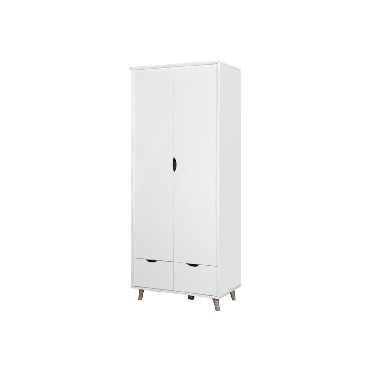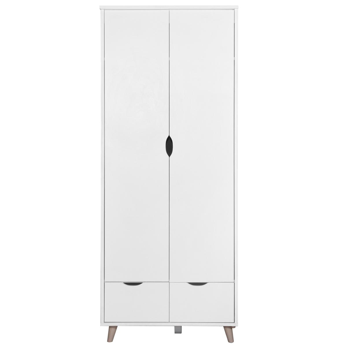 The Pulford contemporary double wardrobe features 2 doors and 2 drawers in a white finish. As part of the Pulford collection, this modern wardrobe feautures a shelf and hanging rail with stylish cut out handle designs. The 2 drawers pull out to reveal even more storage perfect for folded garments.