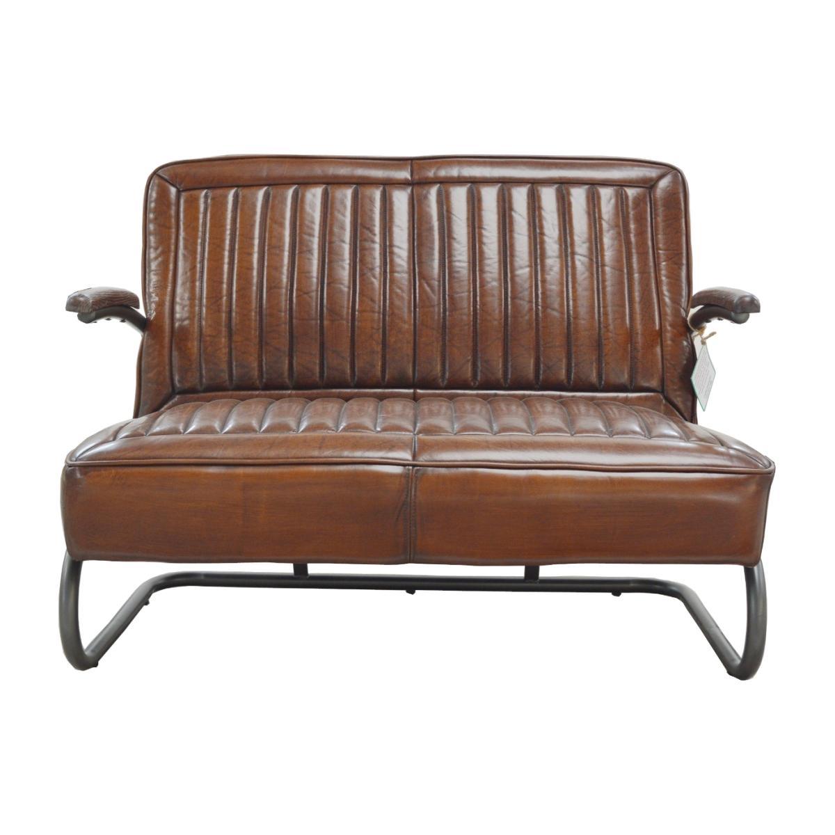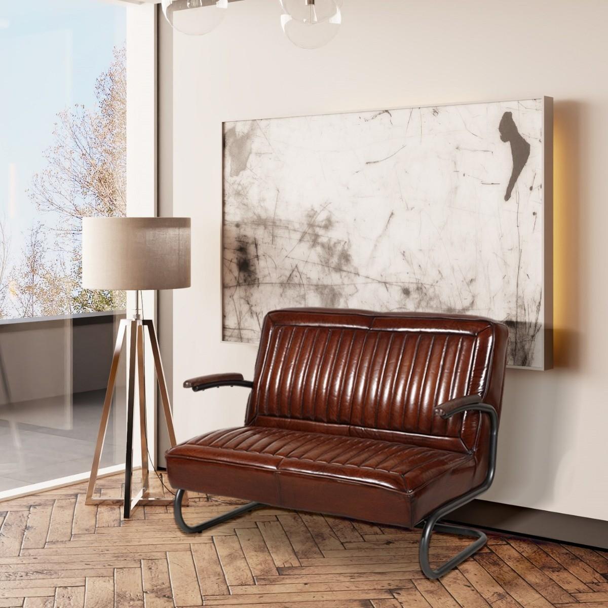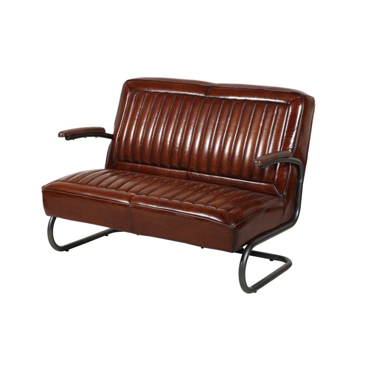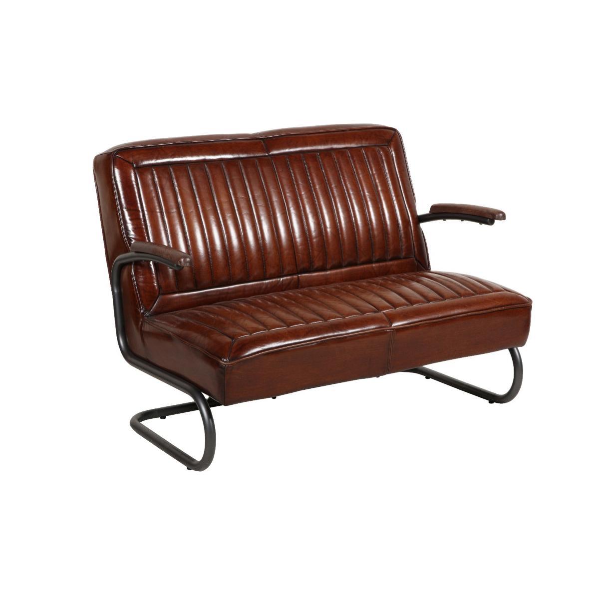 This low vintage-inspired bench makes an attractive feature wherever placed. The warm hues of brown leather and wood entice you to rest and enjoy a little peace. Z-shaped legs give stylish support and a little movement for extra comfort. Time to relax!Vintage-inspired style. Upholstered in Aniline brown leather. Wood on metal armrests. Curved Z-shaped metal legs. Padded seat with vertical stitching
