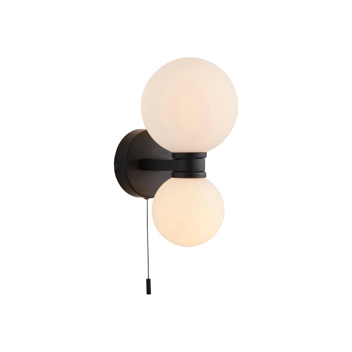 Pulsa Bathroom Globe Twin Wall Light Matt Black Pull Cord Switch IP44 - Matt Black & Matt White Glass