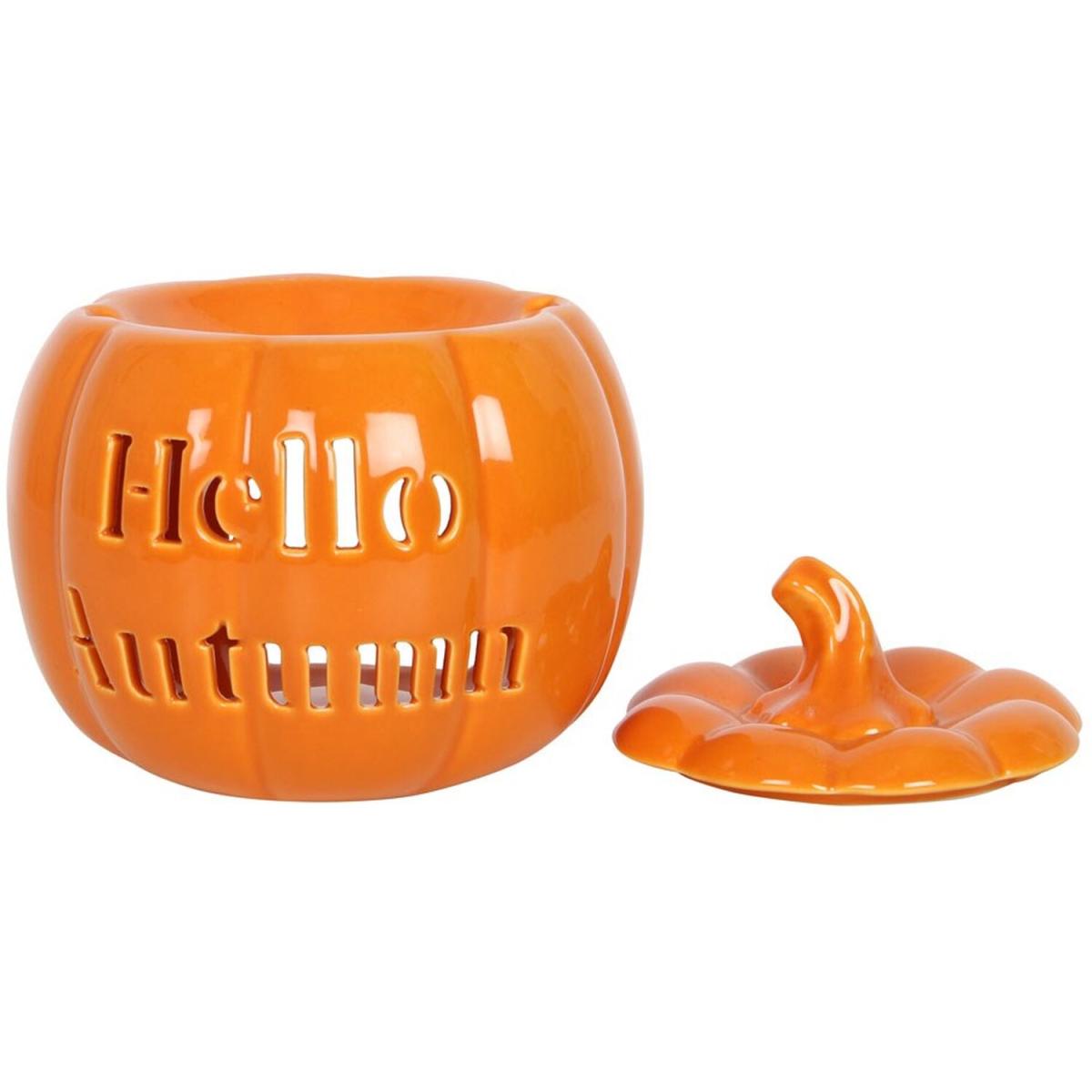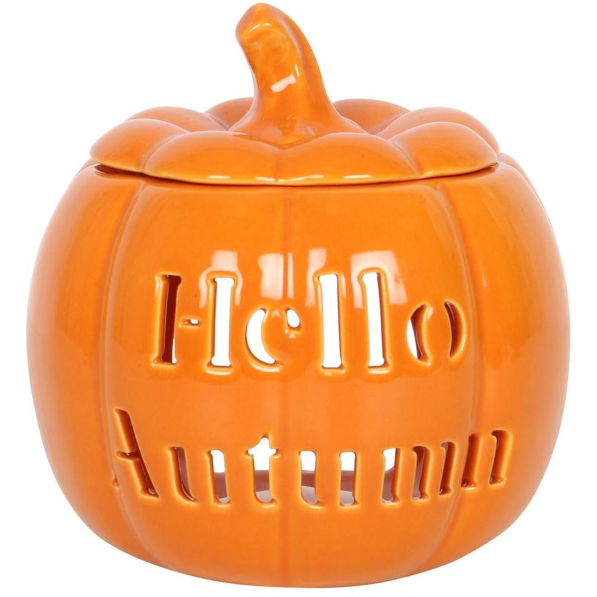 Welcome autumn into your home with this Pumpkin Design Oil & Wax Burner! This stylish feature combines a ceramic oil burner with an elegant cut out text that reads "Hello Autumn". Perfect for providing a pleasant, inviting ambient scent, this oil & wax burner adds a touch of warmth to any space.