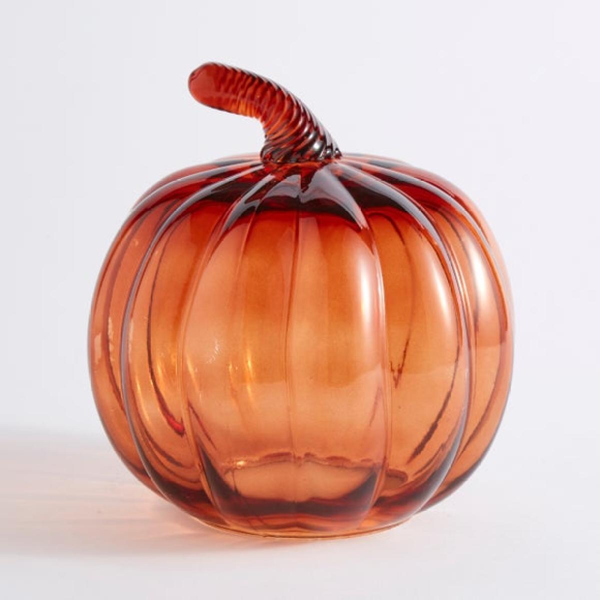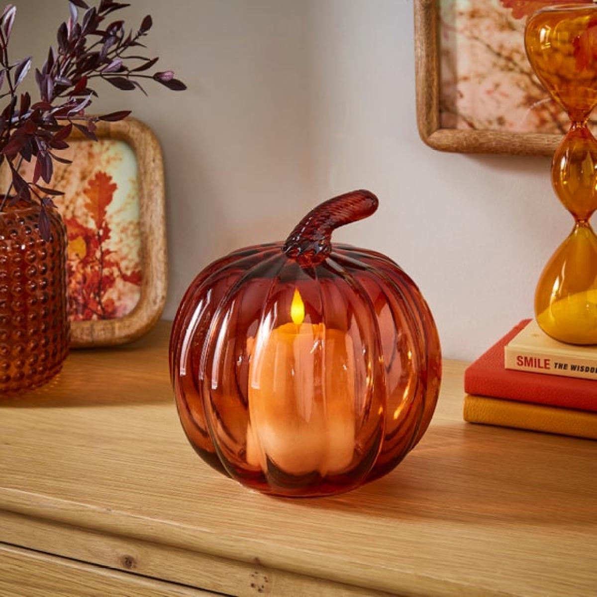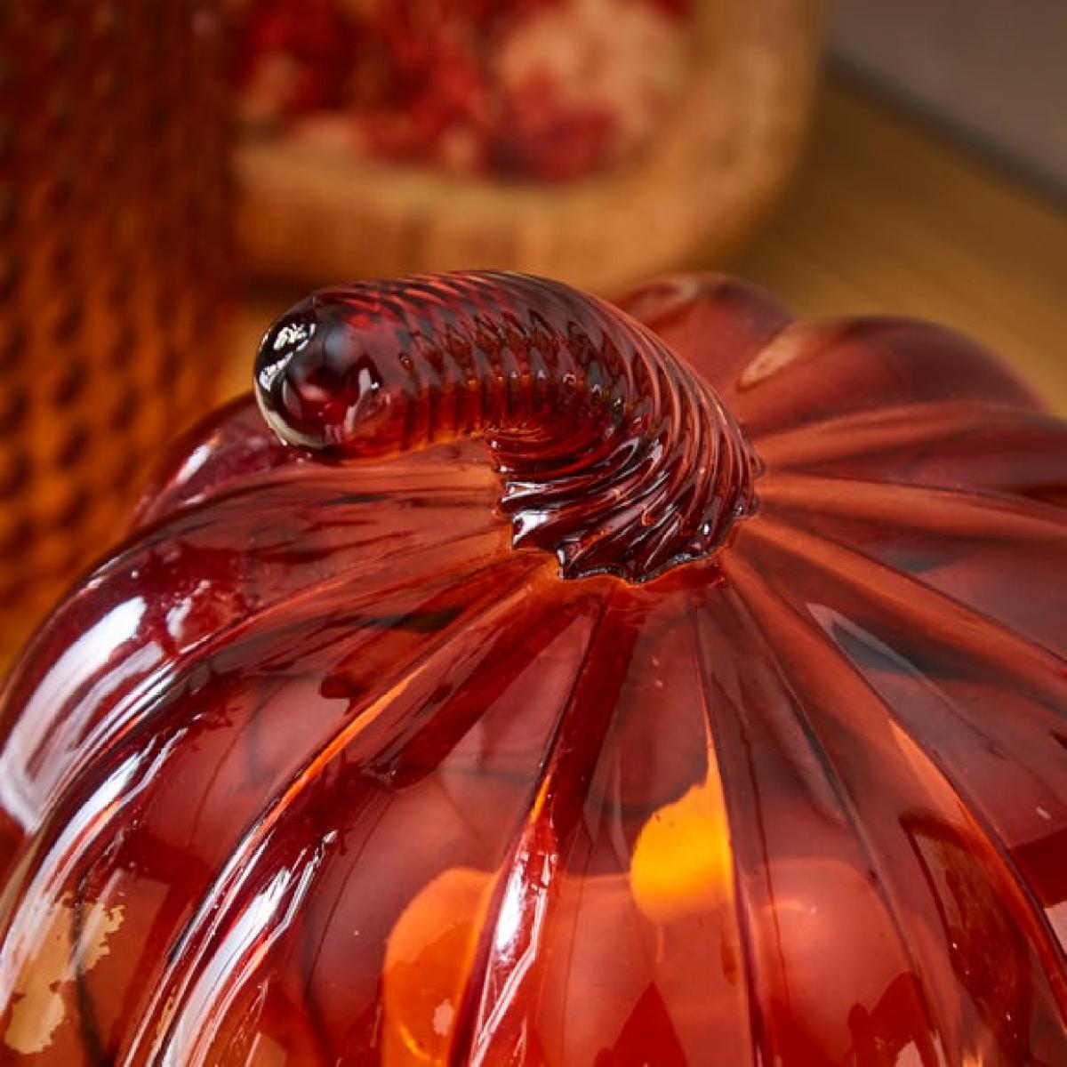 * Hand blown glass * Pumpkin shape * Vibrant orange colour * Suitable for LED candles only Add a warm autumnal glow to your home with this vibrant pumpkin-shaped lantern. Crafted from hand-blown glass in a rich orange tone, each piece is truly unique. Designed for use with LED candles only, it’s a stylish and safe way to bring cosy charm to your space. Perfect for seasonal displays or year-round character. For indoor use only – handle with care and wipe clean with a soft dry cloth. Please note: Suitable for use with LED candles only, measuring max. H 10cm x Dia. 7.5cm.